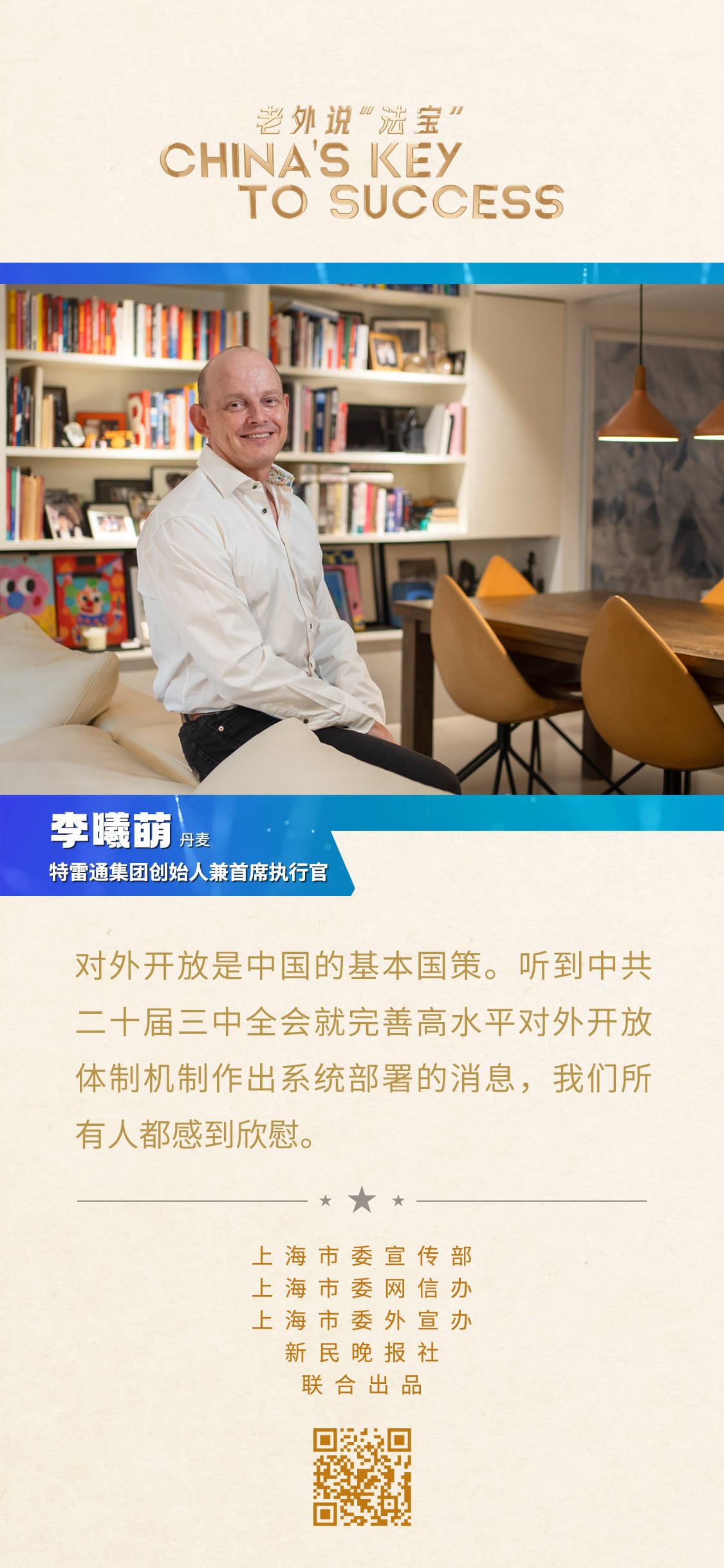 丹麦人李曦萌是名副其实的中国通。在上海生活了32年的他,能用一口流利的中文和中国人侃侃而谈中国的发展,也能用多国语言,向外国人就上海的机遇娓娓道来。
