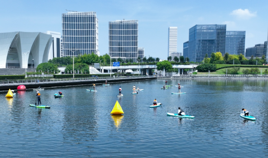 8月8日下午,上海下起倾盆大雨。临近中午,依然有一群不惧雷雨前闷热天气的市民,在户外尽情运动。烈日下,在东体硕大的水域之中,市民尽情戏水体验浆板运动,感受水天一色的都市景观。