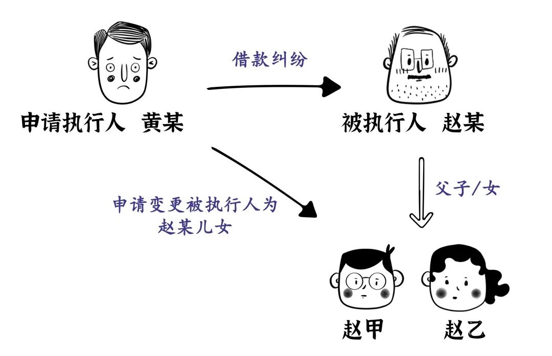 黄某因与赵某之间借款纠纷将赵某诉至法院,法院判决赵某按期偿还向黄某所借款项50万元。因赵某在判决确定的期限内未能清偿债务,黄某向法院申请对赵某强制执行。然而,执行程序中,赵某不幸去世,但其对黄某的债务仍未执行完毕。黄某遂向法院申请将赵某的子女赵甲(兄)、赵乙(妹)变更为被执行人,继续履行判决义务。
