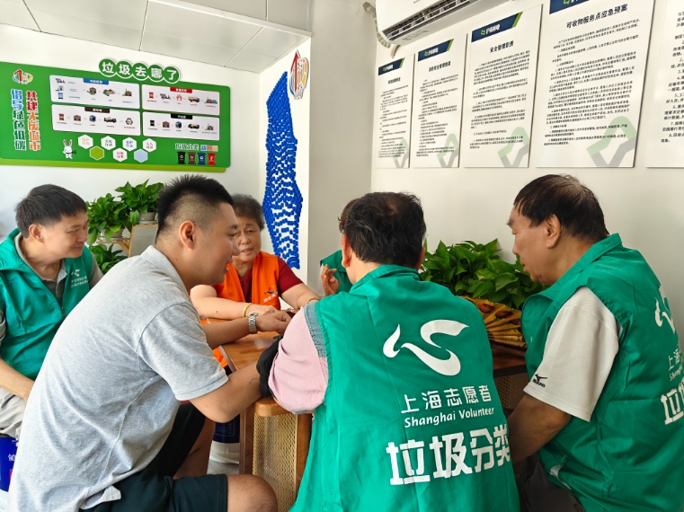 值得一提的是,汉中小区还积极发挥志愿者的力量。自2018年成立以来,这支由十多名热心居民组成的志愿者队伍,一直坚持在投放点指导居民和租户进行自主分类。他们自发制定了排班表,帮助老年居民们使用小程序自助投放可回收物。同时,他们还将自己利用可回收物制作的小手工艺品放在惠民回收服务点内。