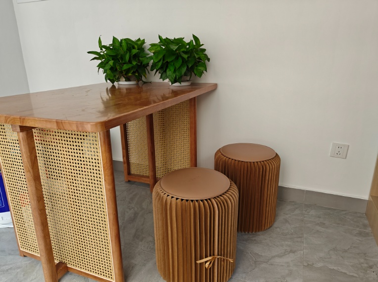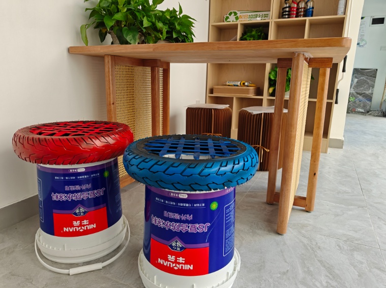同时,服务点的一角被打造成小区垃圾分类志愿者的驿站,摆放着利用可回收物制成的竹木花架、轮胎改造而成的凳子、瓦楞纸折叠而成的座凳,每一件都蕴含着变废为宝的巧思。