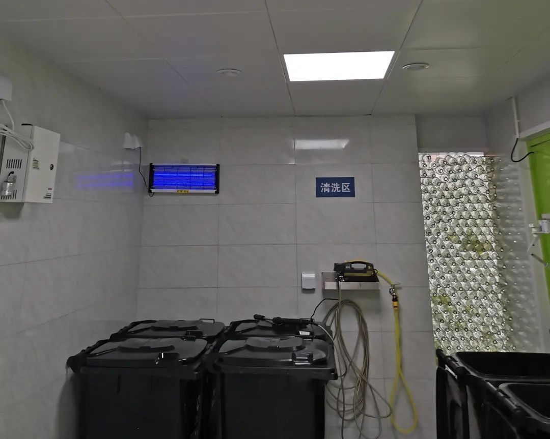新落成的垃圾箱房融入了许多创新科技和环保元素。投口采用了无触式感应装置,可以自动开盖,既方便了居民投放,又减少了二次污染。