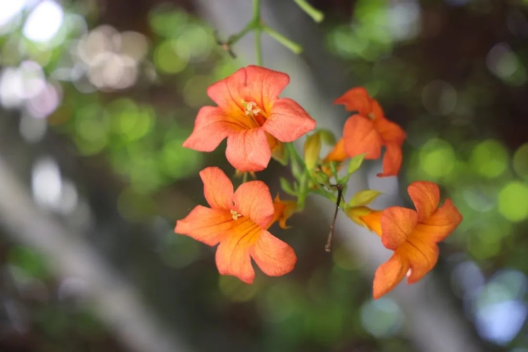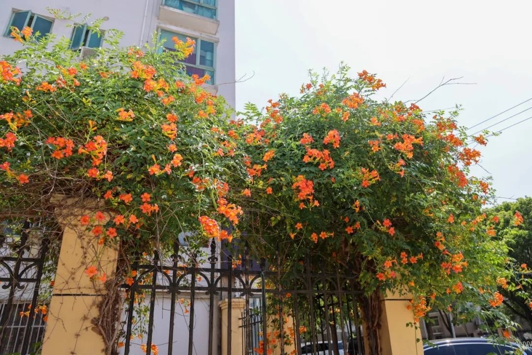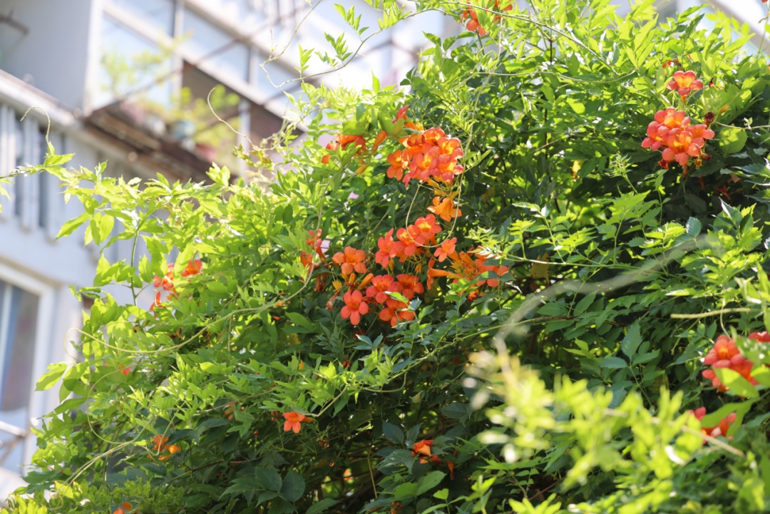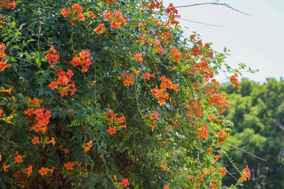 凌霄花也迎着烈日绽放,为炎炎夏日增添了一抹靓丽的色彩。作为攀援藤本植物,凌霄花具有极强的攀爬能力,多种植于围墙、长廊等地,层层叠叠的枝叶爬满墙头,形似喇叭的凌霄花点缀其间,显得十分娇艳。