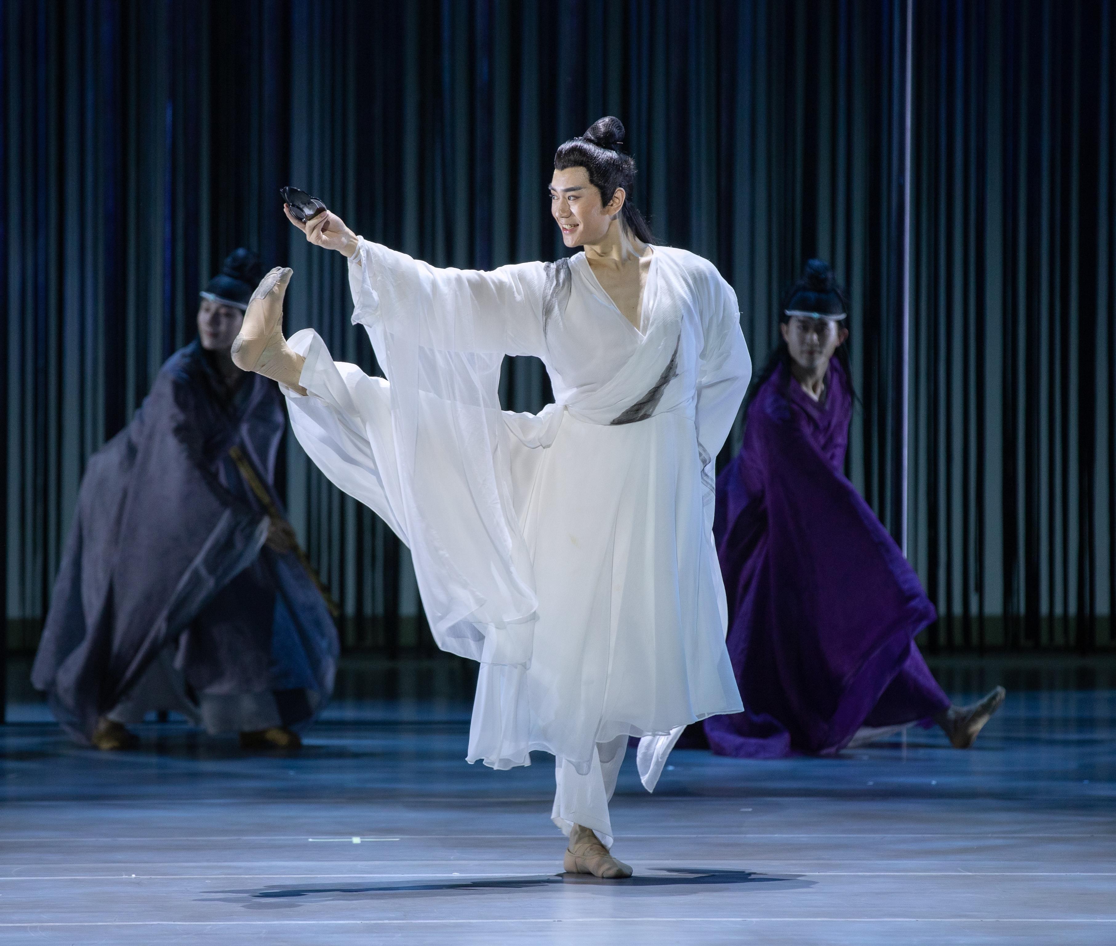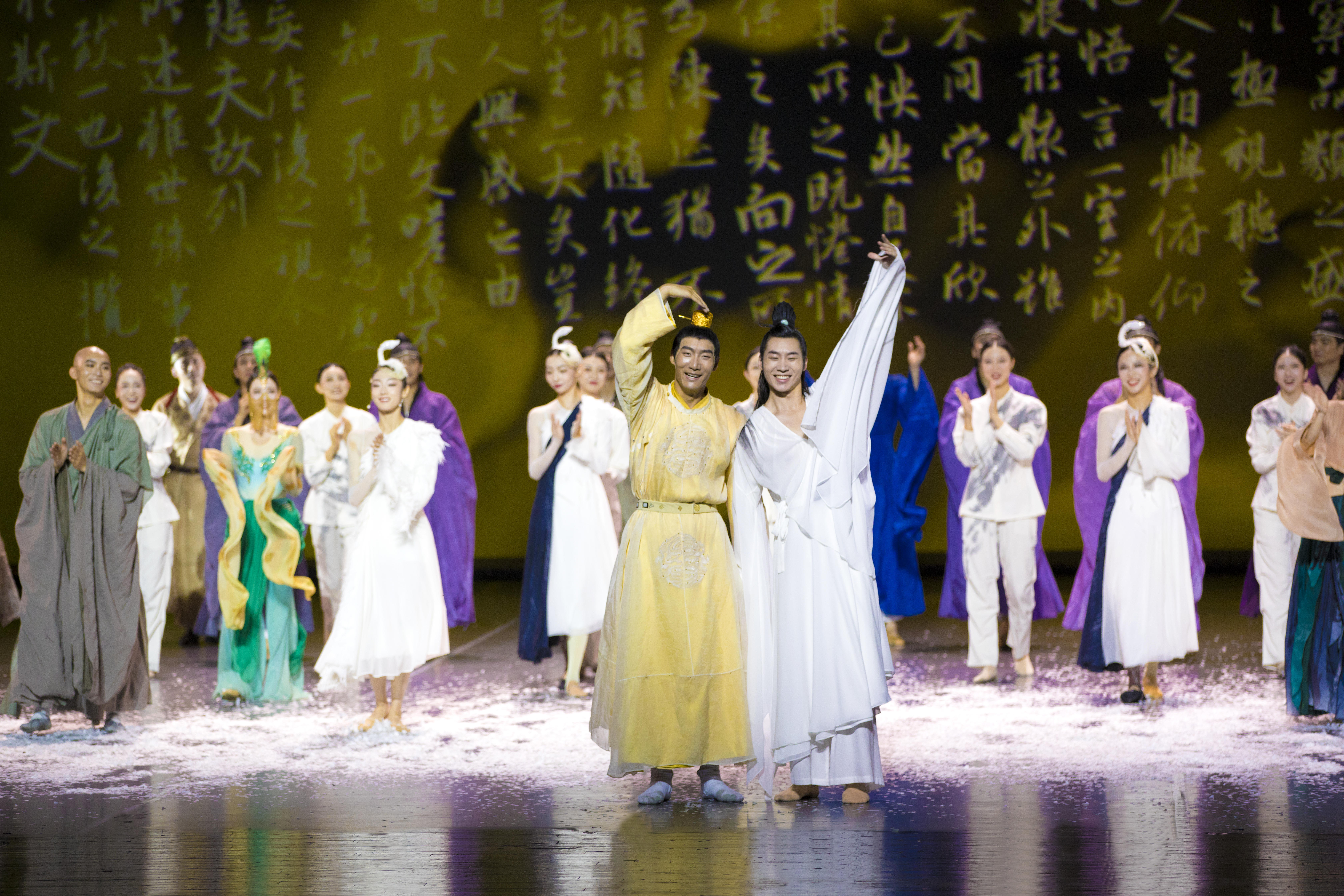 本轮演出中,饰演“王羲之”的演员宋雨历经首轮演出的磨炼,将王羲之刻画得更具层次。特邀舞者张傲月精准诠释出李世民的帝王气度与广阔胸襟。上海歌剧院舞剧团主要演员李盛钊在两天的演出中分别饰演王羲之和李世民,这位“全能”舞者在“书圣”和“帝王”的转换中,准确拿捏住角色的精髓。由上海歌剧院舞剧团首席演员谭一梅饰演的鹅生动传神,与宋雨的双人舞更是将王羲之一生爱鹅、画鹅、从鹅之姿态吸取书法灵感的典故情景再现。