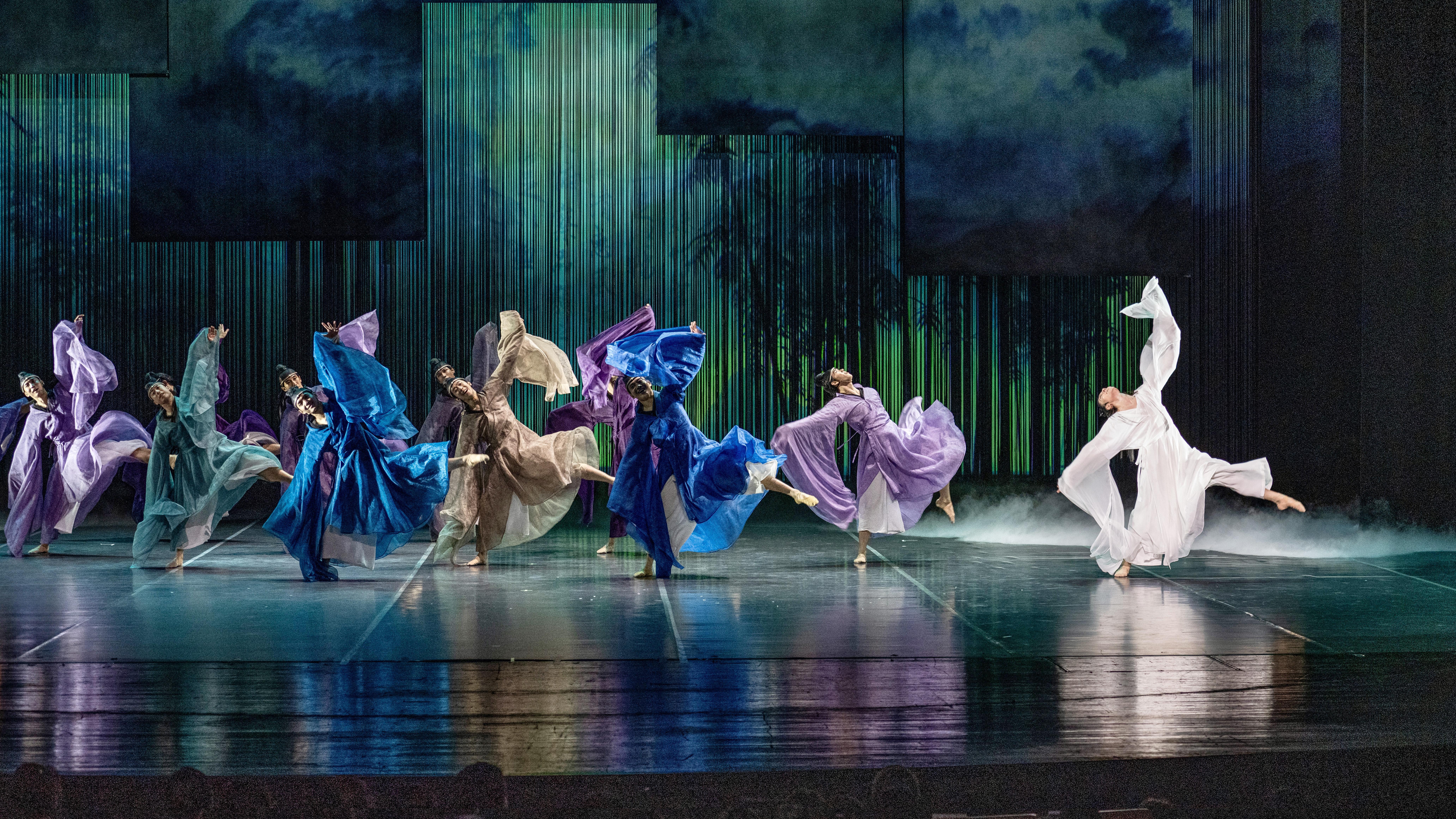 舞剧《永和九年》的时间线由晋唐直至当下,以一位名为“赓”的青年对《兰亭集序》的探访为开篇。在茂林修竹中展开兰亭雅集的流动画卷,探访王羲之的创作之路,不仅围绕“天下第一行书”《兰亭集序》的诞生,更将视角延续到作品及其所代表的书法艺术在后世的传播、继承与发扬光大。