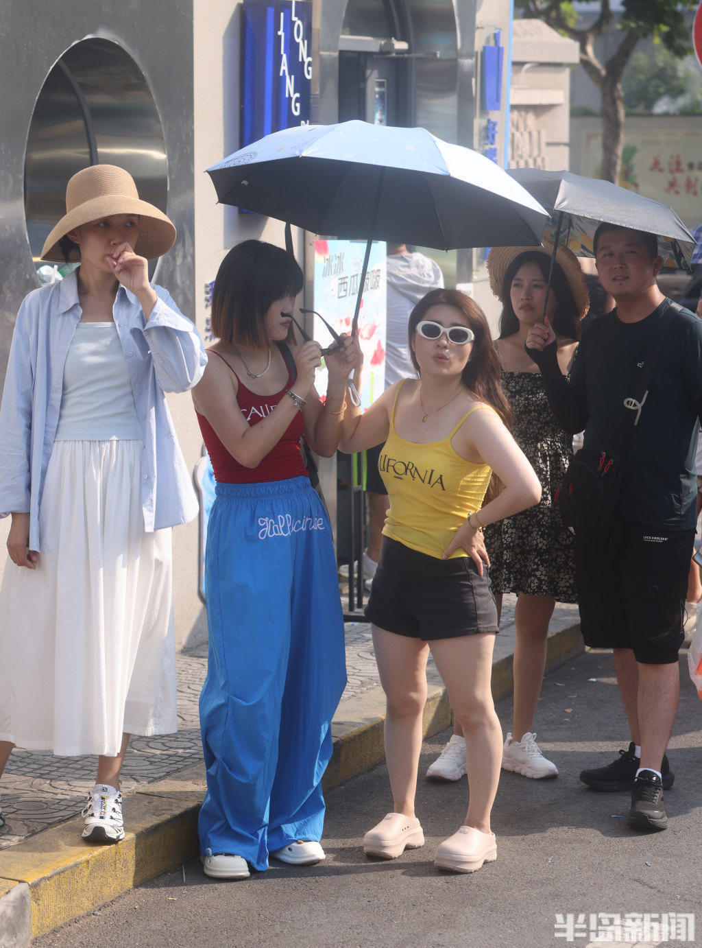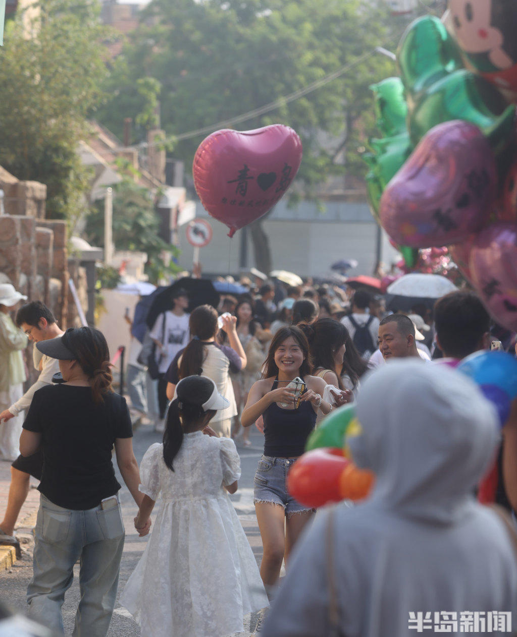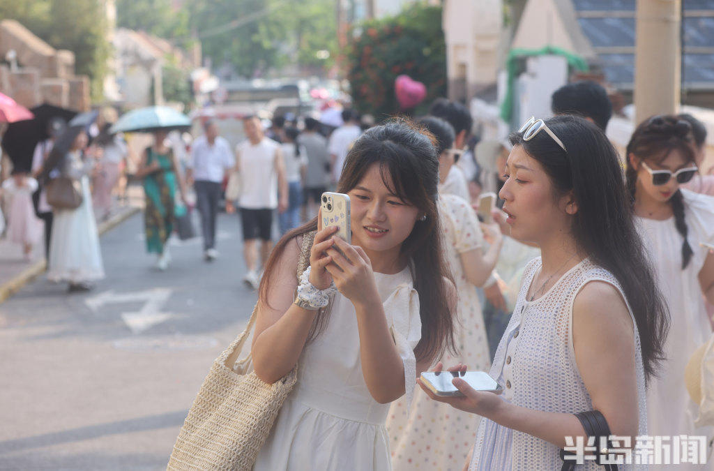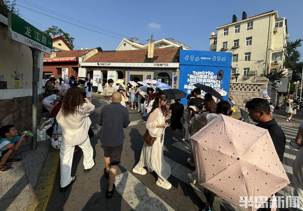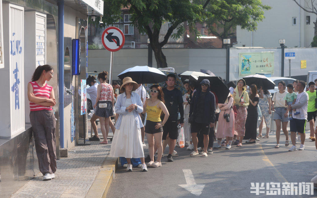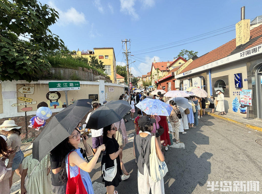 8月13日,青岛市南区龙江路漫画街前,来此拍照打卡的游人排起了长队,虽然天气有些炎热,但是游客们打着防晒伞,依次有序等候。盛夏季节来漫画街游玩的较多,为了保证大家的安全和拍照体验感,这里进行了交通管制,禁止无证车辆通行。