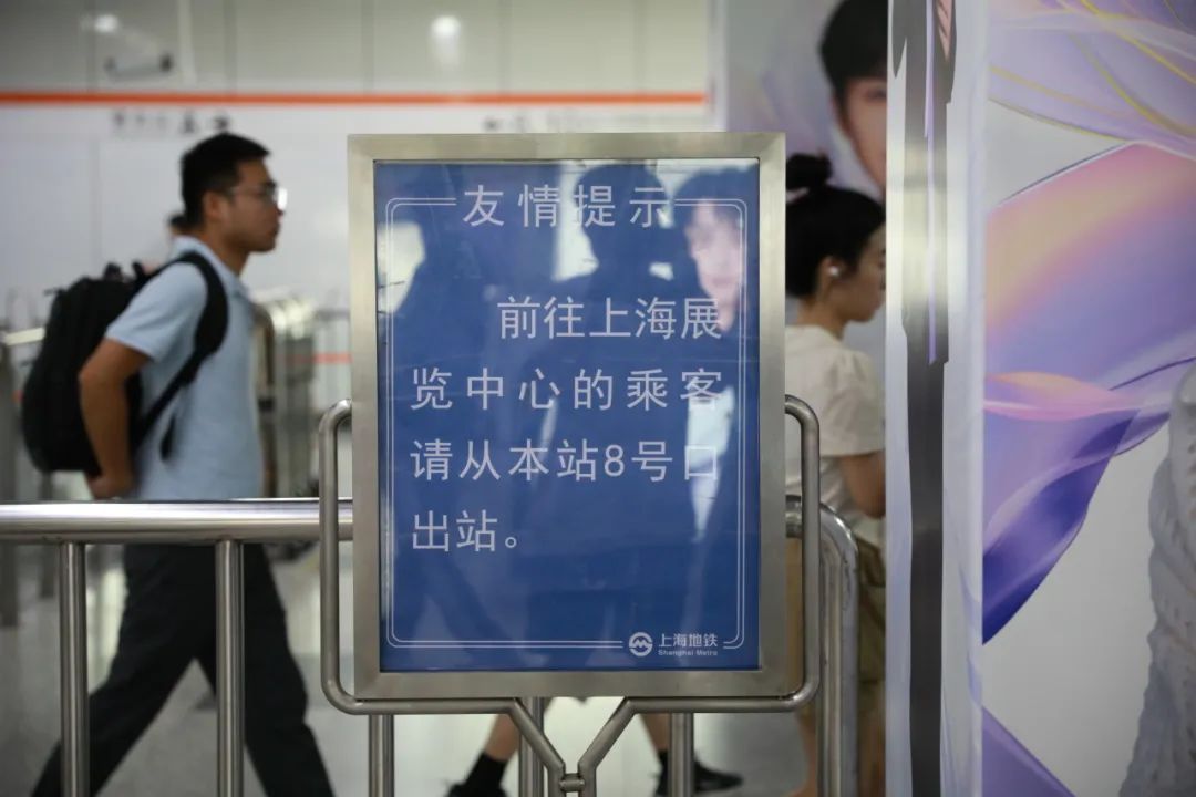 记者分别在靠近2号线、7号线、14号线的区域里,看到了指示牌上清晰写着:前往上海展览中心的乘客请从本站8号口出站。