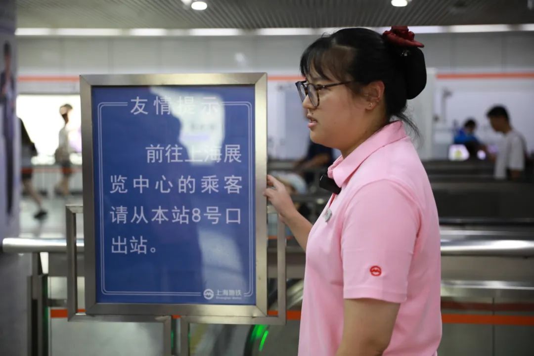 我们静安寺站的2号线、7号线、14号线一共配备了五块指示牌,7号线两块、2号线一块、14号线两块。车站站厅内放置的多个指示牌,指引乘客前往距离书展现场最近的8号出入口,不少使用手机App导航的乘客,也可以准确地找到最佳路线。”
