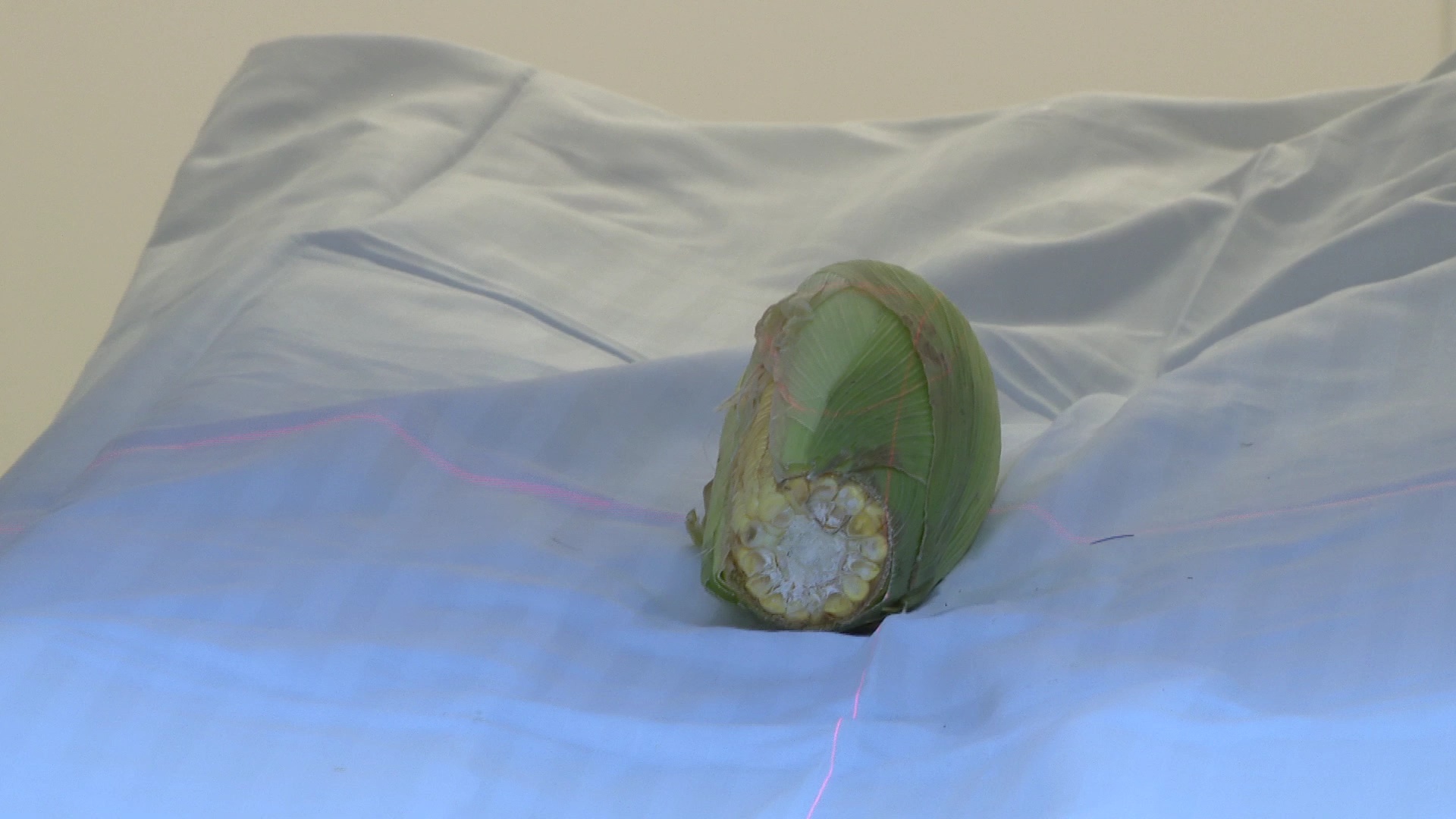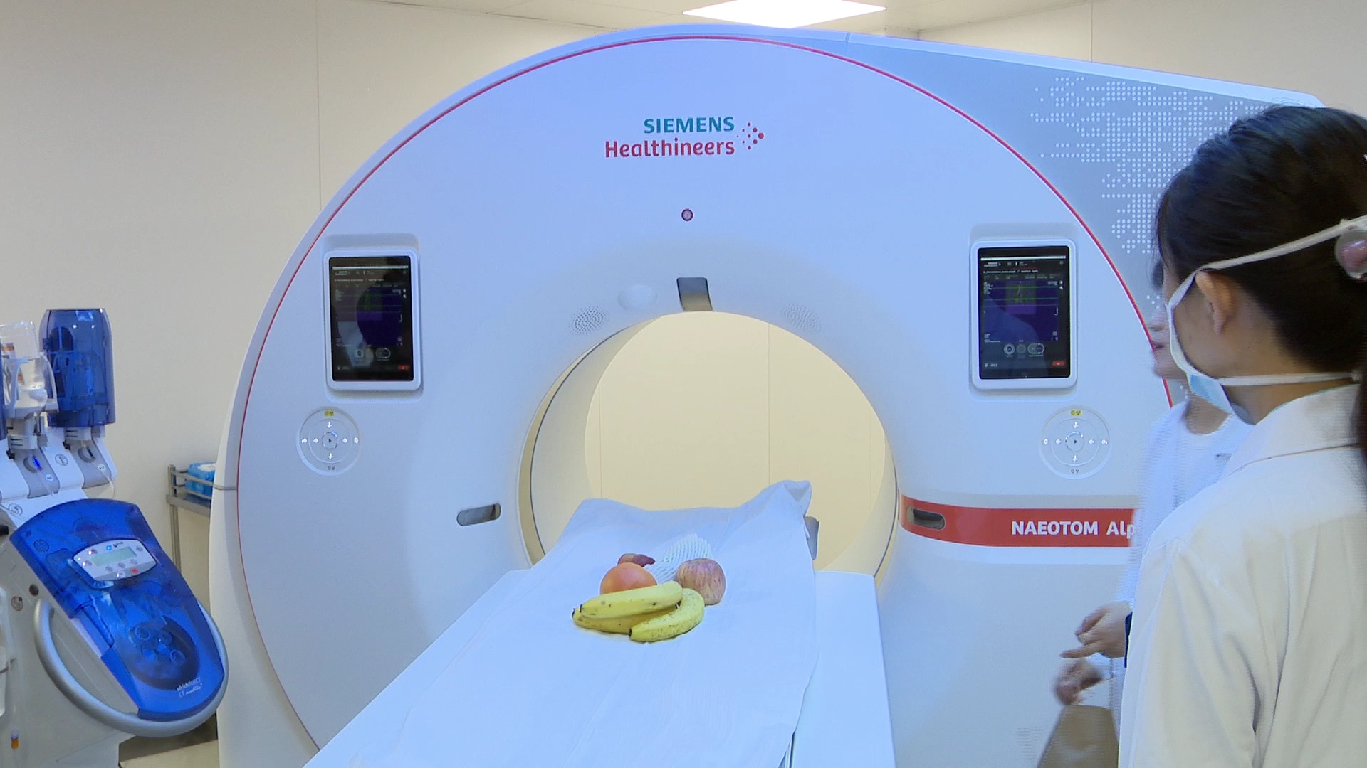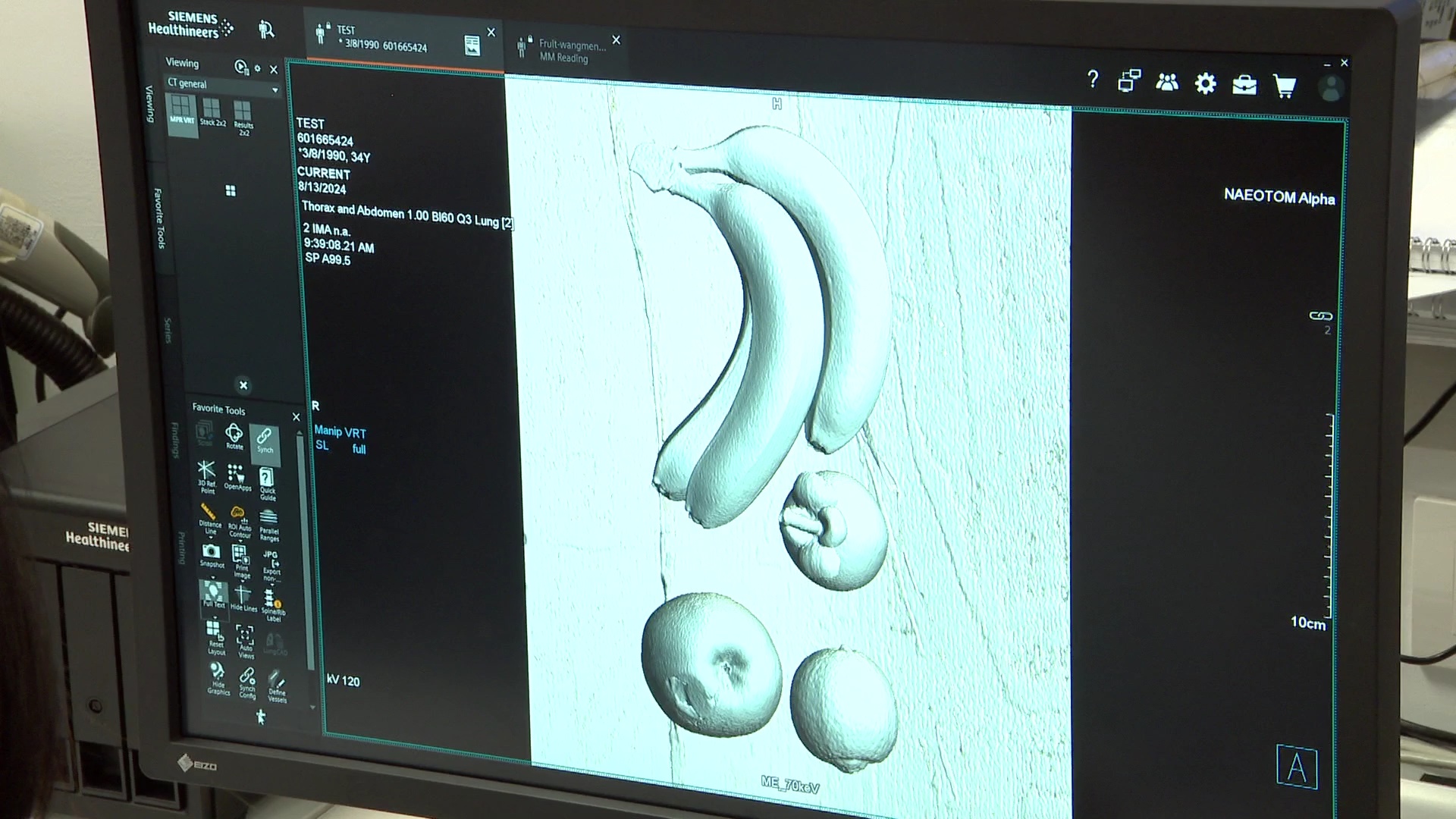 营员们小心翼翼地将几个常见的水果和蔬菜——一只稍有腐败的苹果、三根熟透的香蕉以及一根新鲜的玉米——依次摆放在检查床上。营员们在技术员的指导下,开始了这次奇妙的扫描体验:定位,设置扫描参数,一键开始扫描,随着电脑屏幕上的加载条慢慢填满,仅仅过了几秒钟,一幅精美的3D图像开始逐渐呈现在众人眼前。