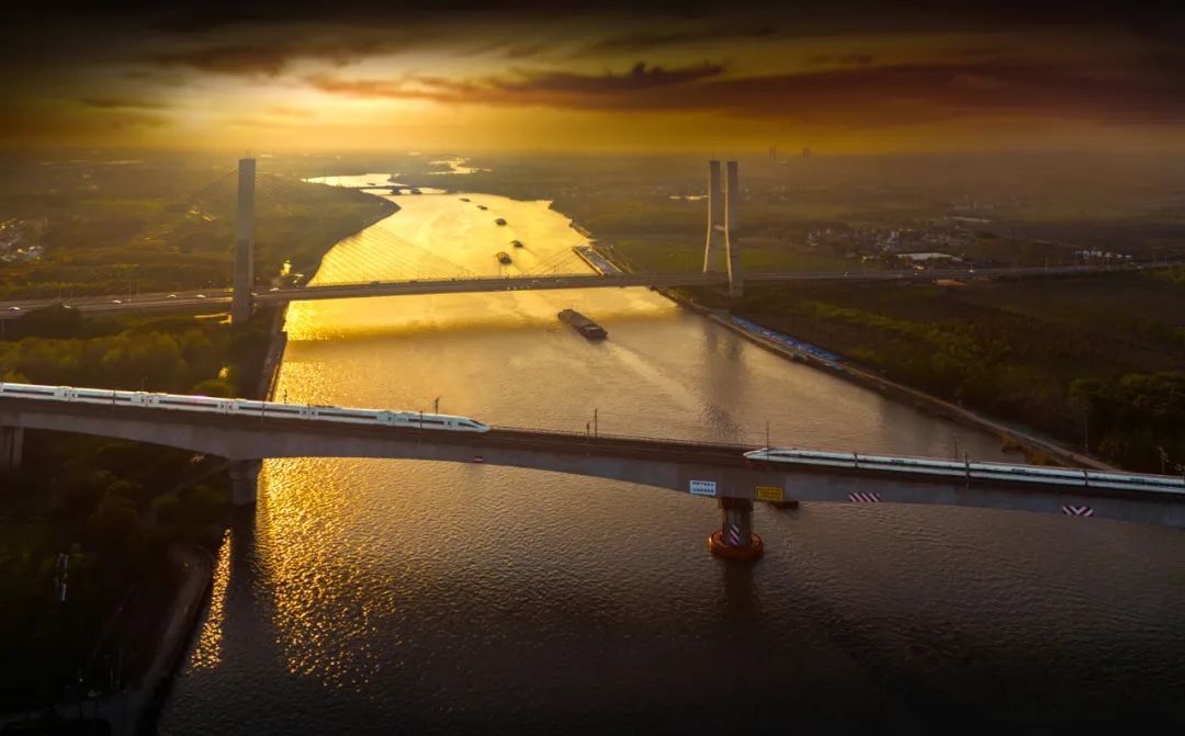 踱步慢慢欣赏,几乎每一位观众都会发出惊叹,原来我们生活的城市是如此美丽。陪伴我们四季的松江是韦海《霞映跨塘》中的美丽倒影,是顾伟强《春之韵律》中的盎然绿意,是蒋建新《党建》所见辰山植物园里夏花簇拥的国徽,是贾林彬《飞琴走弦》中被秋叶环绕的图书馆和青少年活动中心,是钱国钿《护珠残雪》中的雪装佘山。山林与高楼之外,也有不少航拍摄影师把镜头对准了松江的建设发展,如姜辉辉《G60科创云廊》中的璀璨灯河、屠建花《浦江之上》中,两列和谐号在余晖中相遇的美丽瞬间。