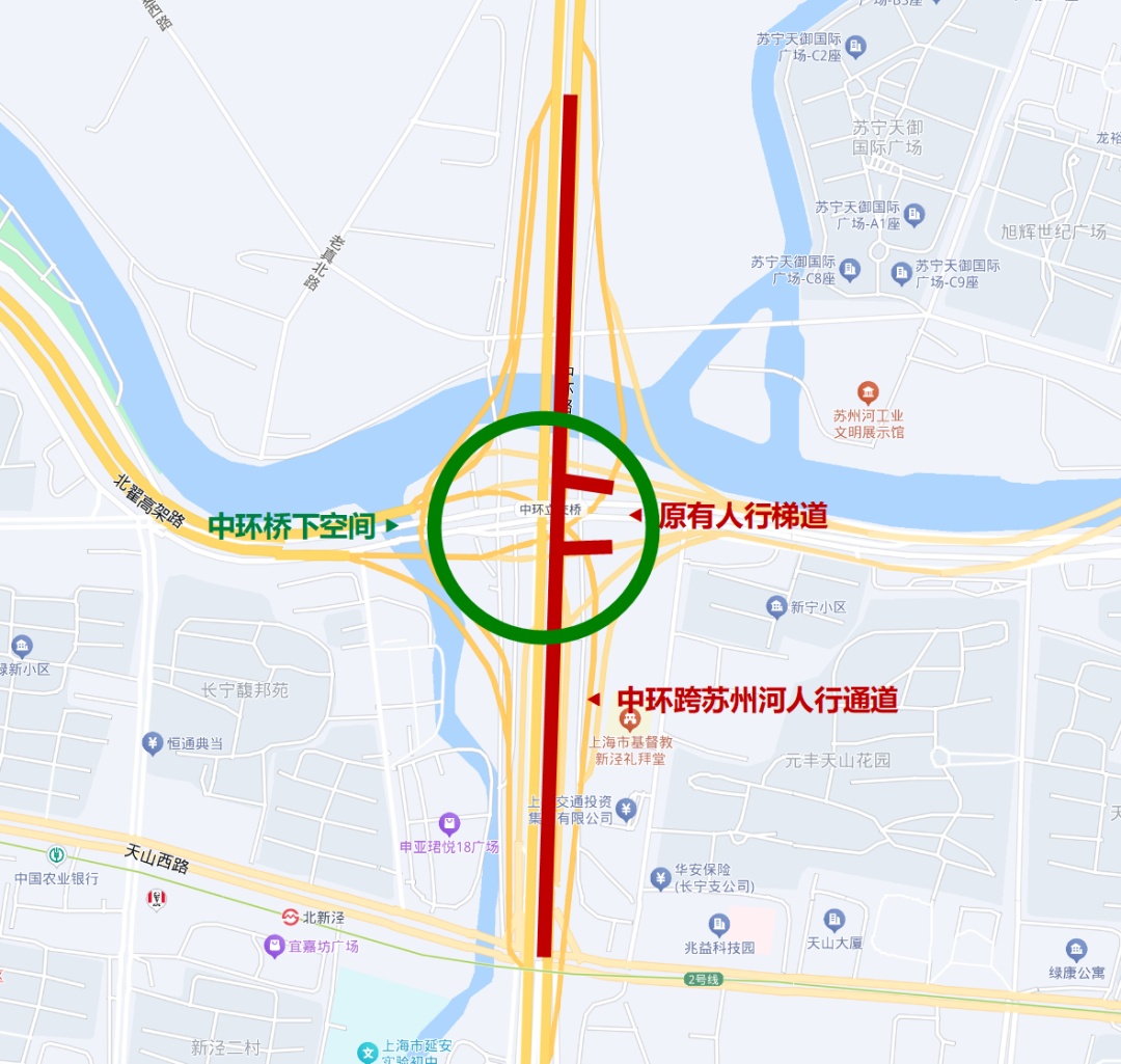 经市交通委、市道运中心和长宁普陀两区建管委(交通委)、交警部门、公投公司多轮会商研究,最终决定对中环跨苏州河立交东侧的非机动车道进行交通组织优化,腾出空间新辟人行通道,确保人行功能进一步完善的同时,桥梁结构和安全性能完好。