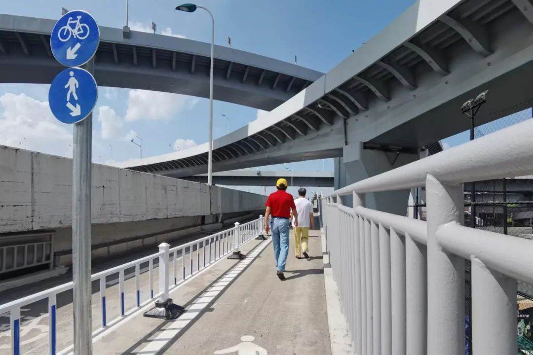 据了解,中环跨苏州河立交建设年代相对较早,当时在西侧设置一条人非通道,东侧则仅设置一条非机动车通道。随着苏州河沿线住宅楼宇不断增多,公共配套设施逐渐完善,桥下空间和慢行步道先后建成,居民的跨河出行需求也日益增长。今年上半年,北新泾街道和区人大代表、政协委员提出完善中环跨苏州河立交东侧人行功能的建议,区建管委听取后,随即向市交通委进行申请,着手制定方案并落实改造,以满足居民实际诉求。