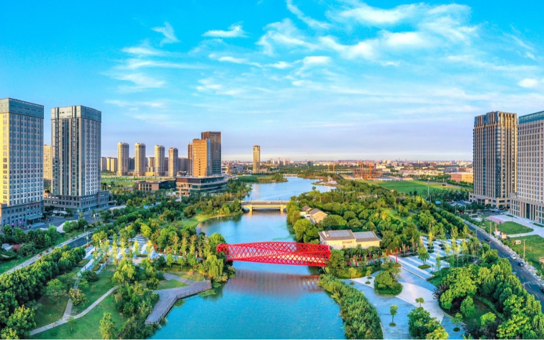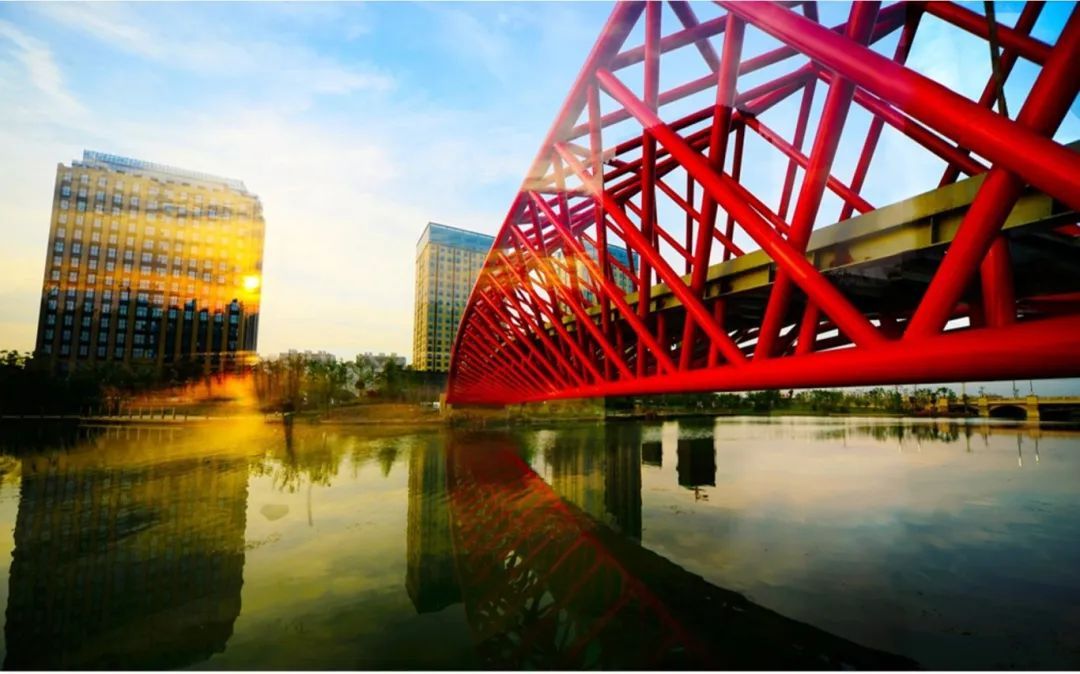 新开环河位于松江新城国际生态商务区的核心地带,环形的河道两侧集聚了高耸的商务楼宇。河道设有慢行线路,总长达2035米,沿途拥有多样的亲水岸线和丰富的植物景观,营造了季节分明的自然美景,为周边居民和商务区员工提供了亲近自然的场所。
