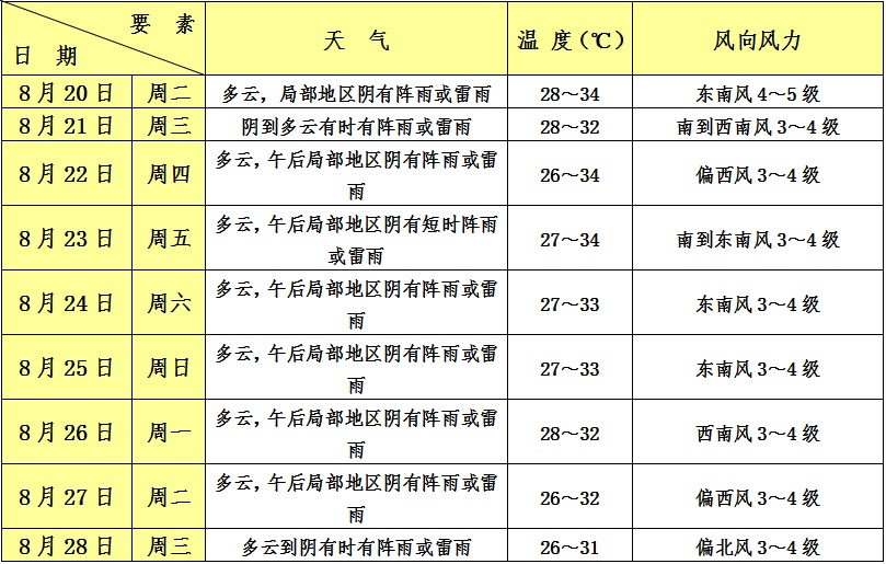 21日前后受高空槽影响,本区将有一次较明显的降水过程。未来几天本区气温仍较高,最低气温26~28℃,最高气温32~34℃。