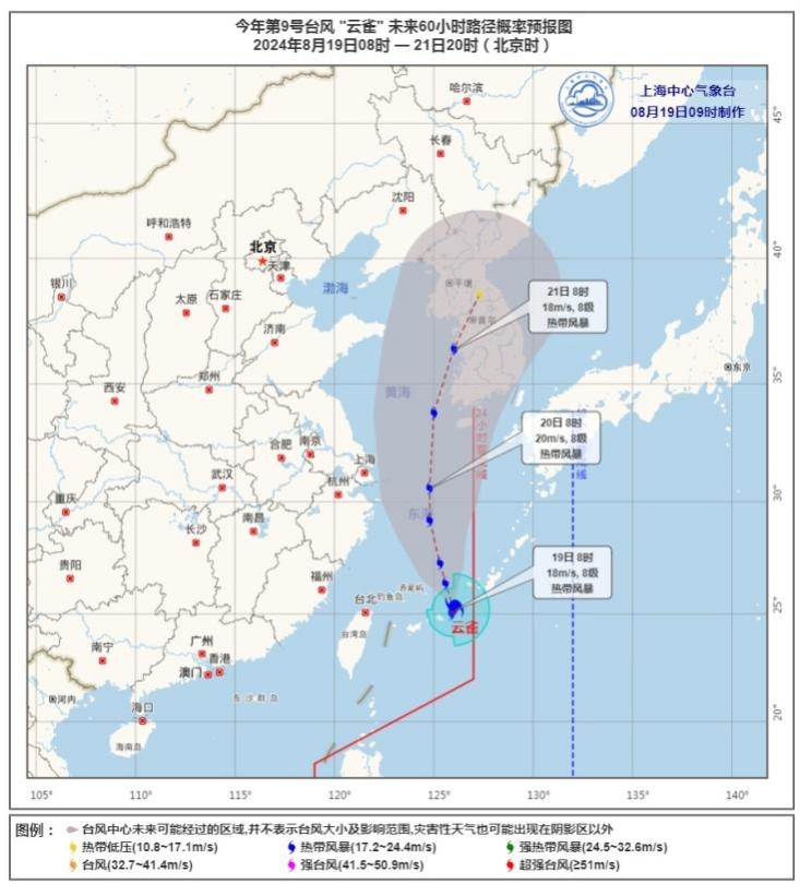 “云雀”将以每小时25公里左右的速度向偏北方向移动,即将进入东海,未来强度变化不大,进入黄海后将逐渐减弱。预计台风“云雀”将于20日上午到中午过上海人民广场同纬度,距离上海南汇嘴最近距离约300公里。