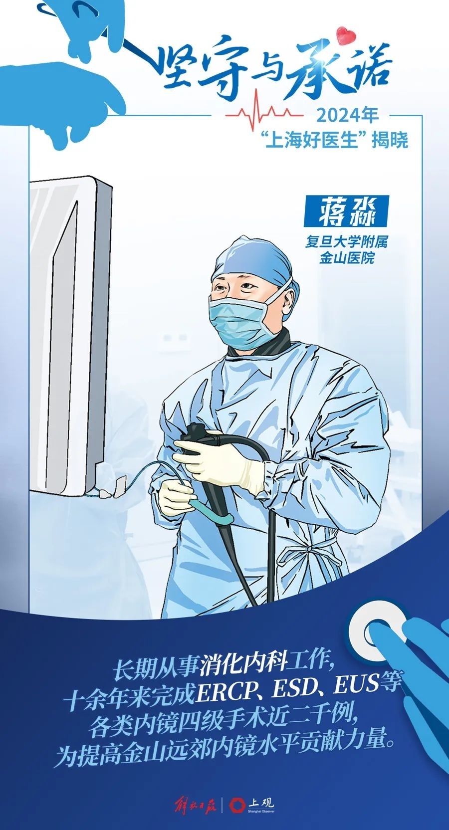 今天(8月19日)是第七个中国医师节,在下午召开的庆祝第七个中国医师节暨2024年“上海好医生”宣传表扬大会上,来自复旦大学附属金山医院的医生蒋淼荣膺“上海好医生”称号。 蒋淼(右二) 蒋淼 据悉,2024年“上海好医生”寻找推选活动由市委宣传部、市文明办指导,市卫生健康委、市卫生健康系统精神文明建设委员会主办,解放日报社、上海尚医医务工作者奖励基金会协办,全市20位医务工作者荣获“上海好医生”,10位荣获提名奖。 二十余载一诺 让父老乡亲在家门口看好病 一起来认识这位金山好医生! 医生简介 蒋淼,中共党员,主任医师,现任复旦大学附属金山医院消化内科和内镜中心副主任(主持)。 自2001年参加金山医院工作,蒋淼长期从事消化内科临床工作。在这平凡的二十多年临床工作中,蒋淼刻苦专研医疗技术,始终把患者放在第一位,将“精医术,诚医德”作为自己的座右铭,凭着一双妙手和一颗仁心挽救了无数患者的健康与生命。 多年磨剑填空白,“医”路奋进 蒋淼深感郊区医疗水平与市区三甲医院之间存在一定差异,许多患者不得已要往返市区就诊,舟车劳顿,十分不便。2011年以来分别于市三甲医院与国外进修学习高级内镜技术。 独立开展内镜黏膜下剥离术、内镜黏膜下肿瘤切除术、内镜逆行胰胆管造影术、肠道肿瘤狭窄支架置入术、超声内镜、内镜下经皮胃造瘘术等技术,让金山及周边百姓在家门口就能享受与三甲医院同质化的优质医疗。 在熟练掌握现有的内镜技术外,还研究探索两项内镜新技术:内镜下尼龙绳联合金属夹治疗高危消化性溃疡出血、与外科合作开展内镜下逆行阑尾炎治疗术,均获得上海市卫健委课题立项。 从事内镜工作以来完成各项内镜检查三万余例,四级操作近二千余例。个人被选举为上海市消化内镜分会委员,获得上海市卫生健康系统“优秀工作者”“金山工匠”“白求恩精神践行者”“上海湾区奋进者”等荣誉称号。 百姓需求为“灯”,“医”心为民 蒋淼从医以来,一直保持一颗仁心,急患者之所急、忧患者之所忧。无论患者是贫富贵贱,都将患者的生命健康放在第一位。认认真真检查、一丝不苟分析,解释病情耐心仔细、施诊治疗虑周藻密。 每次手术前他都要反复思量,设想手术方案和应急措施,每次术后下班前都要仔细查看患者,掌握患者病情变化。夜间遇到危重患者需要急诊胃镜抢救,他随叫随到。 只要有需要,无论是深夜、还是周末节假日,都能在内镜中心看到他的身影。“早一点治疗,病人就少一点危险,就早一点好转回家”,蒋淼对这种“加班”的工作模式早就习以为常。“病人什么时候需要我,我就什么时候出现”,这也是他的口头禅。而父老乡亲脸上的笑容和一句最简单的谢谢,也是蒋淼在无数个深夜和凌晨的力量来源。一诺千金重,蒋淼已经用了二十余载的岁月去践行它。 早癌早治是防止消化道肿瘤的重要环节,基层又是早癌防治的重要一环。蒋淼在繁忙工作之余,经常下基层去社区卫生中心开展工作,向社区医务工作者和社区老百姓进行消化道早癌预防和治疗的科普教育。也通过医院公众号、电台、新媒体等多种形式宣传早癌防治知识,提高全民健康意识。 百花齐放春满园,“医”路前行 2019年,蒋淼担任消化内科、内镜中心副主任(主持)以来,十分重视科室的学科建设,大力培养医师队伍。每年派1-2名医生前往市三甲医院进修学习。 “健康所系,性命相托”,蒋淼在平凡的岗位上二十余年如一日,时刻牢记职业赋予的神圣使命,坚持以病人为中心,全心全意守护金山百姓的健康,为保障健康金山的发展作贡献。 记者:杨惠聪 朱磊 通讯员:张慧涨 编辑:何小燕 责编:陈薇婷、俞岚婷 审核:陈建军、林堃