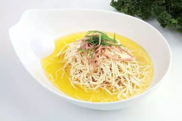干丝即豆腐干丝,切得越细越好,所以对刀工的要求比较高,配合开洋和火腿一起煮,鲜香可口,丝丝入扣。