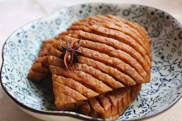 兰花豆腐干形似兰花,因为在制作过程中加入了八角、桂皮、花椒等香料,香气浓郁,口感筋柔。