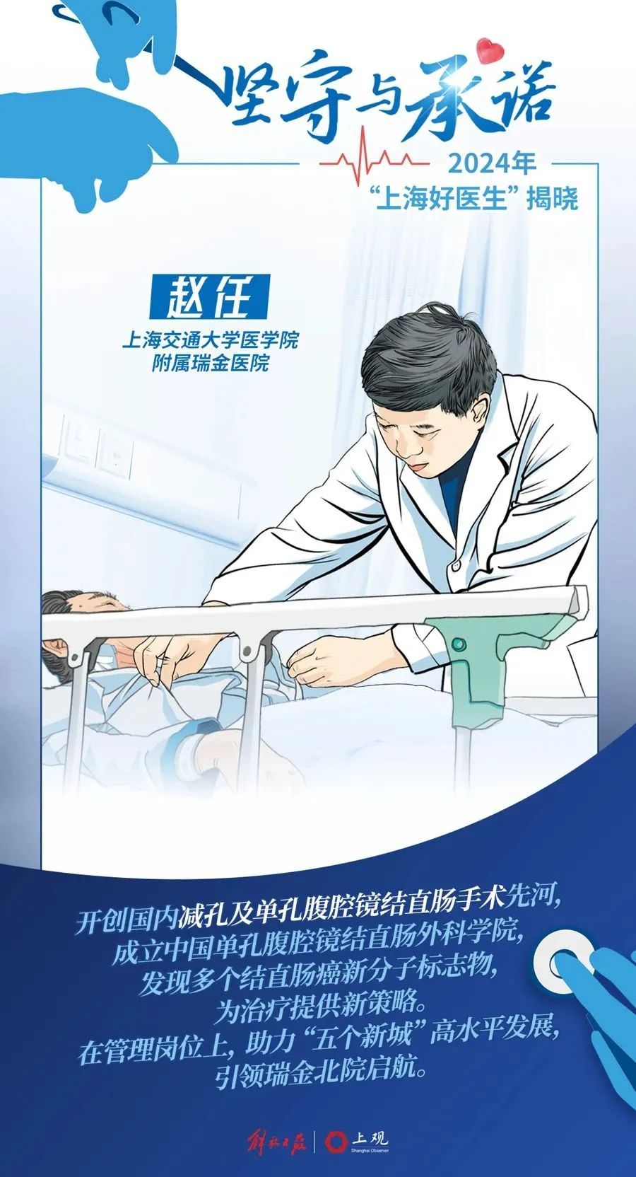 赵任教授长期扎根医疗临床第一线,在肠道疾病领域深耕33载。他致力于结直肠恶性肿瘤微创化、系统化、精准化诊疗体系构建,率先开展减孔及单孔腹腔镜结直肠手术;赵任率先应用达芬奇手术机器人系统和国产手术机器人系统,并在国内率先开展腹腔镜手术联合术中放疗治疗局部进展期结直肠癌,保护周围器官功能,显著改善患者术后生活质量;他牵头成立瑞金手术机器人研究所,亲自参与器械研发,并与微创、术锐等多家手术机器人企业建立合作,推动我国手术机器人产业创新发展,力求让医学科技创新优势更多惠及患者。