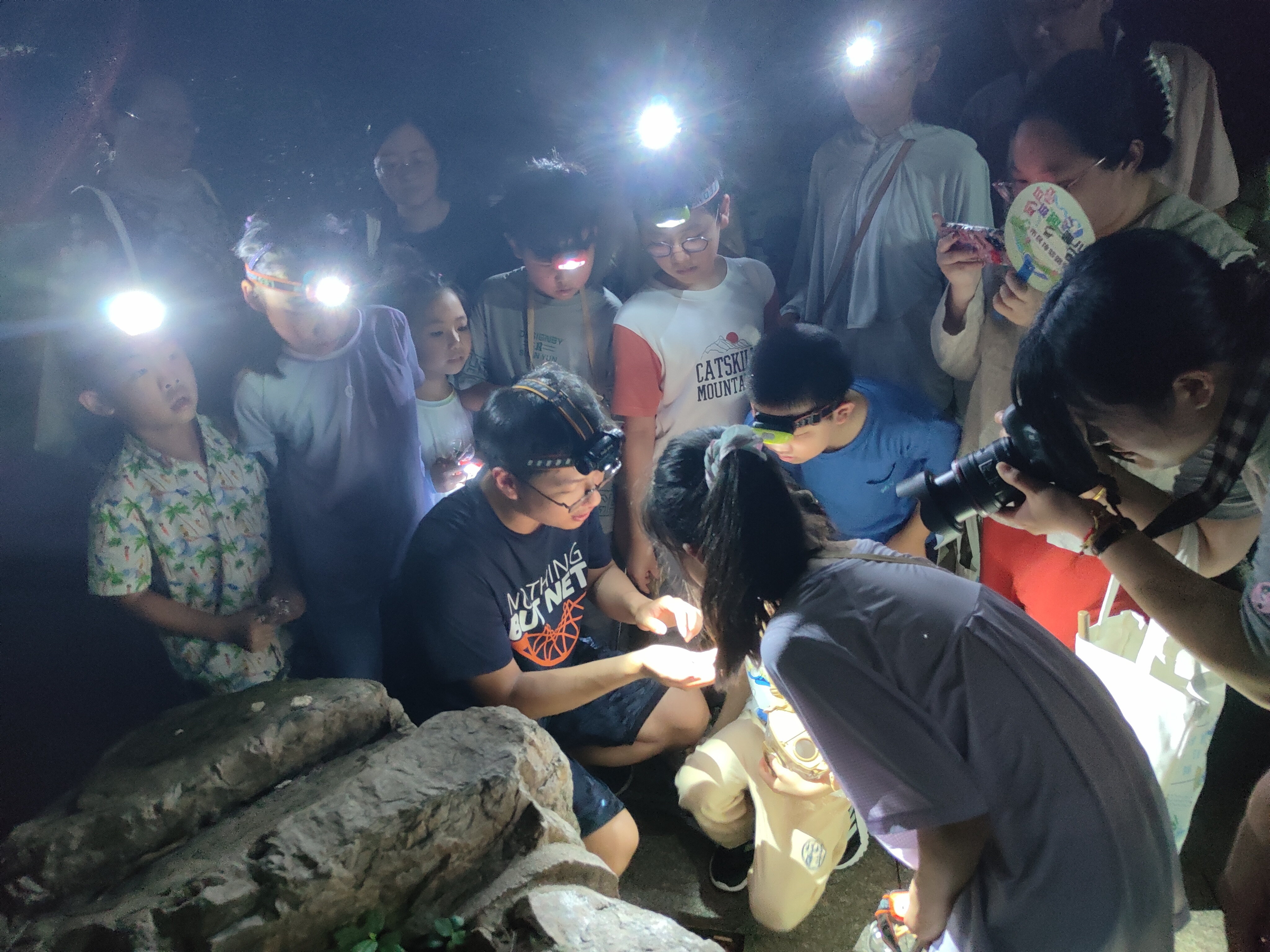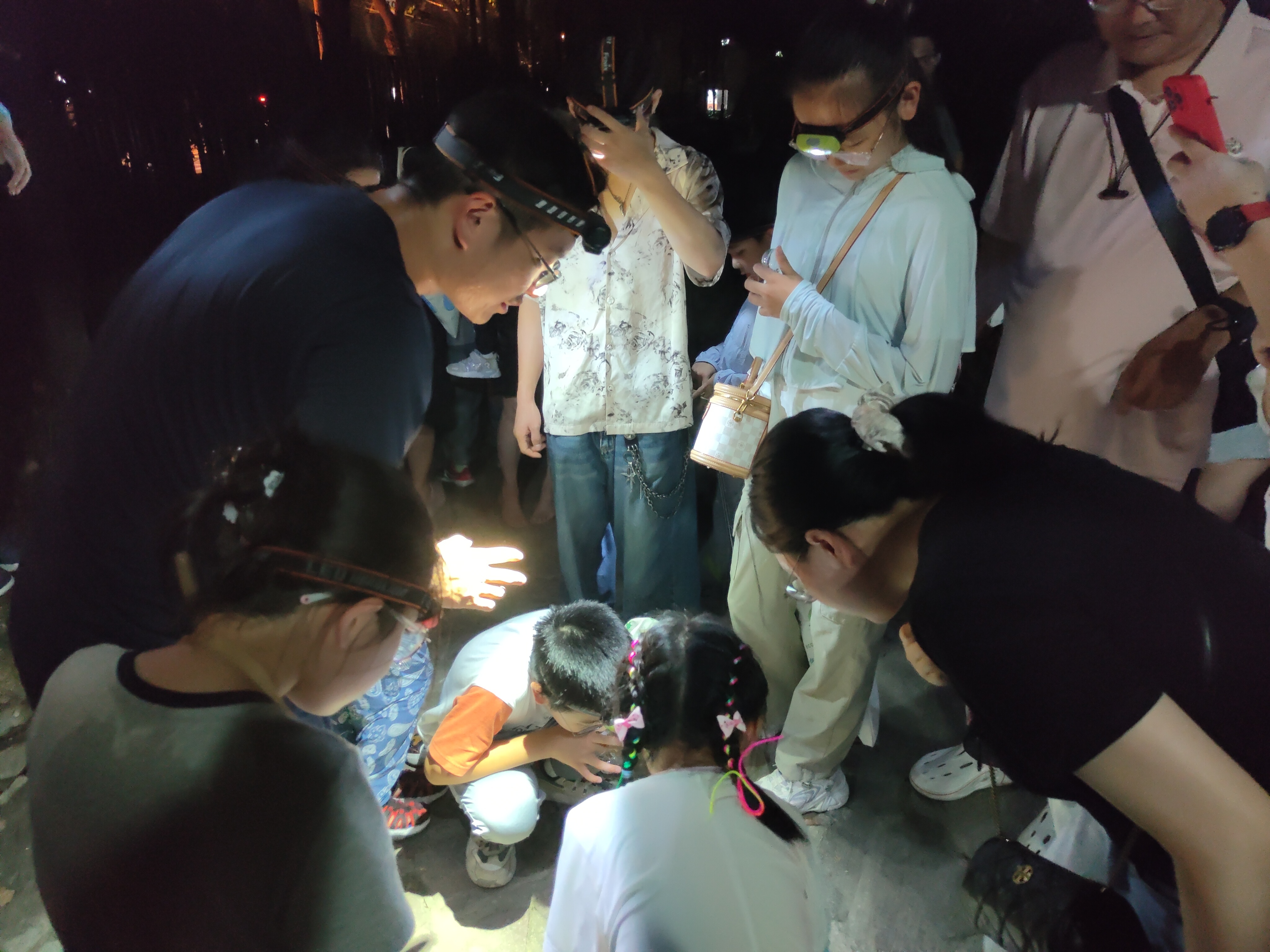 “嘘,仔细听!”走到一处池塘边,一种声音吸引了大家的注意。老师告诉队员们,“这种清脆悦耳的叫声来自小黄蛉蟋,它是蛉蟋科的一种,体长在1厘米以下……”在探灯照射下,不少飞虫也映入眼帘,“这是水边摇蚊一类的蚊虫,蜻蜓幼虫也生活在水中。”