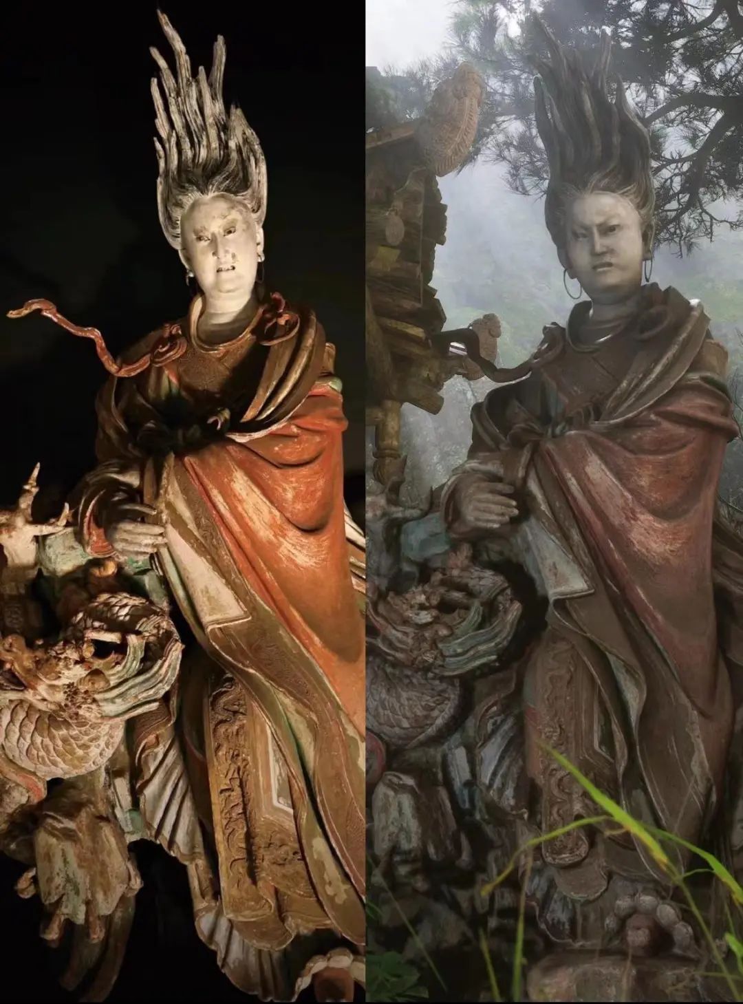 △左为晋城玉皇庙的二十八星宿塑像之一“亢金龙”,右为游戏场景,图片源自山西文化和旅游厅。