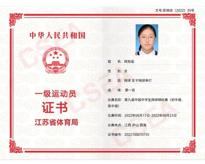 交汇点讯 2024年中国中学生网球联赛总决赛于 8月12日至19日在山东日照举行,被誉为“南通郑钦文”的江苏省海门中学高二(3)班陆知遥同学,在高中组女子单打比赛中夺得全国总决赛冠军。本次比赛共吸引全国117所学校、451名运动员参赛。此前,陆知遥在5月份的2024年中国中学生(青少年)网球精英赛U16组别同样取得了女单第一的好成绩。