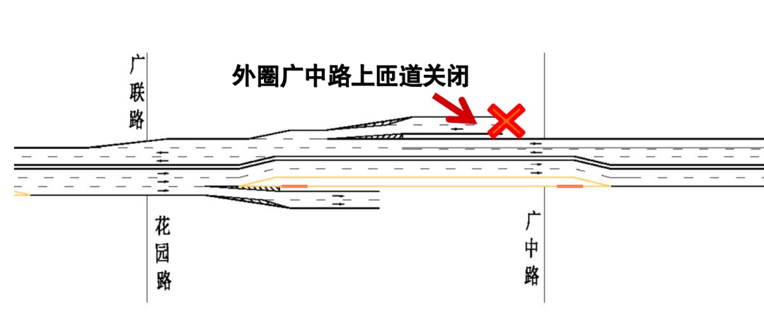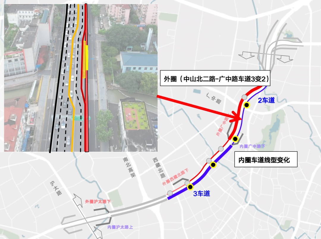 8月24日(周六)、25日(周日)6时至24时将局部占用内环高架(广中路-中山北二路)内圈主线1根车道。届时,高架主线断面车道布置有所调整,现状外圈(中山北二路-广中路)3根车道将临时调整为2根车道,确保主线双向4车道正常通行。此外,外圈广中路上匝道将临时关闭。