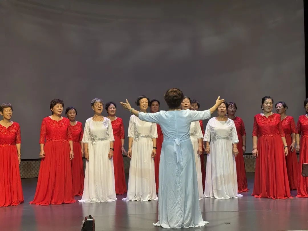 文小艺剧场的舞台上,一群阿姨穿着演出长裙,正在指挥中放声歌唱,歌声婉转动人。这是彩排中的安亭新镇快乐女声合唱队,由附近的退休女性居民组建而成。她们报名参加了“我要上村晚”才艺大赛,正在为8月24日的复赛做最后的彩排准备。