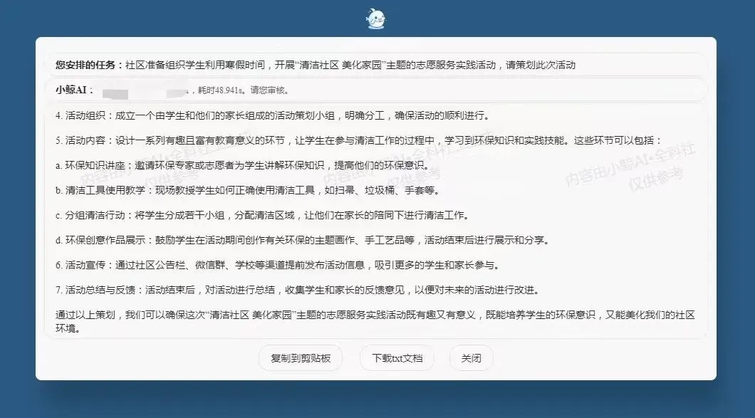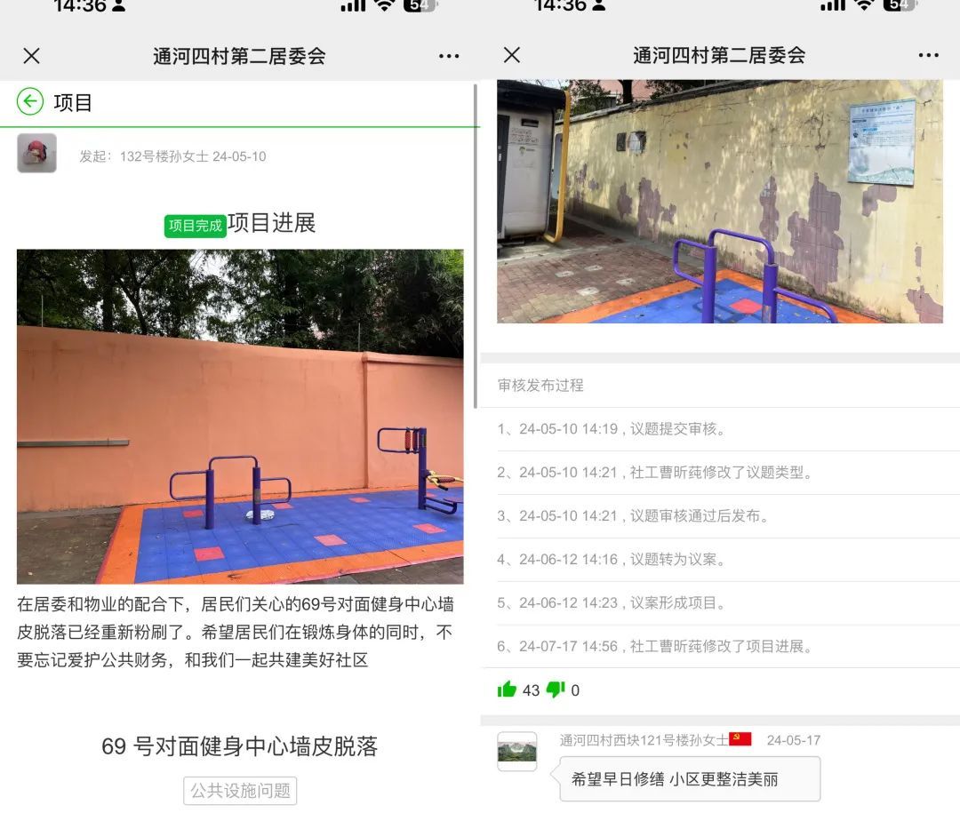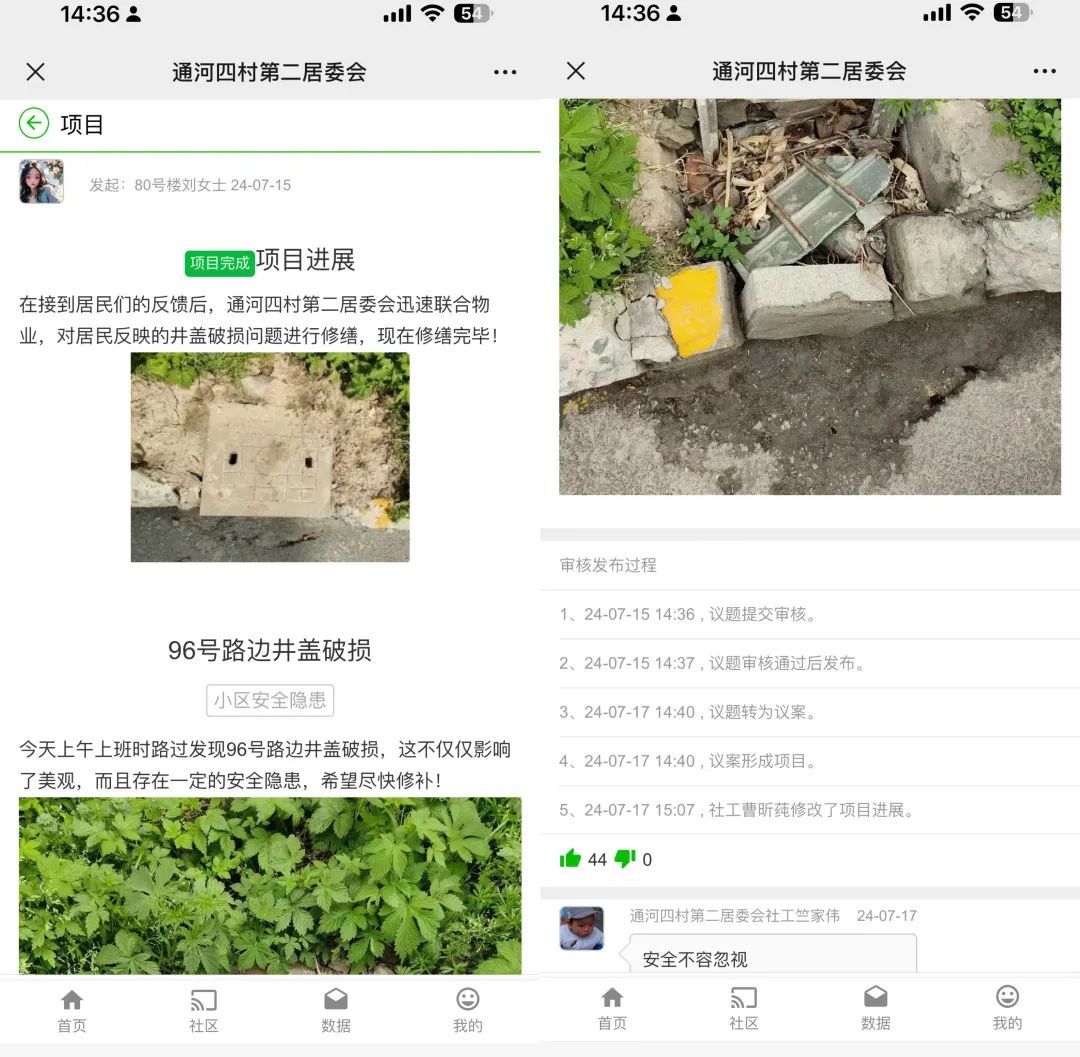 居委小曹使用全科AI的界面 idea用完了?去找全科AI助手!活动顺利开展,孩子们和家长都拍手称快、意犹未尽,表示希望再多一些活动,这让居委小曹一下子犯了难,还能开展什么活动呢?希望能够打破思维定式。正巧,全科社工AI在通四二试点,为此小曹将“难题”给到了AI助手小鲸,同时结合“社区小先生”闯关清单,最终在AI助手的助力加持下,不仅丰富了居委干部的后备知识库,还确定了活动主题:交通调查员、最美清道夫的活动,同时也让居委顺利完成了活动策划。 居委表示,这场活动得以顺利开展多亏了AI助手小鲸提供了一个较为全面的思维框架,可以在各个维度下进一步补充和细化内容,共同形成丰富多彩的创意和实用性的建议方案。 “今天下班时路过发现96号路边井盖破损,这不仅仅影响了美观,而且存在一定安全隐患,希望尽快修补”“69号楼对面的健身中心点位墙皮脱落,影响美观建议修补”……以上是来自通四二的社区居民在“社区通”平台议事厅板块发起的议题,居委会后台收到后高度重视,第一时间前往现场察看情况,由居民区党总支牵头联合“三驾马车”力量迅速响应,逐个击破居民“急难愁盼”问题,对于居民反映的井盖破损问题进行修缮,用时两天项目落地!健身中心墙皮脱落问题也到修缮,已在7月中旬完成重新粉刷,居民在留言处也都表示会爱护公共设施,一起共建美好社区。 下一步,张庙街道将继续加速推进“四个城区”建设,依托“社区通”平台让民生跟着“民声”走、民意伴着“民益”行,切实帮助居民解决实际困难和问题,增强居民群众的获得感、幸福感和安全感。