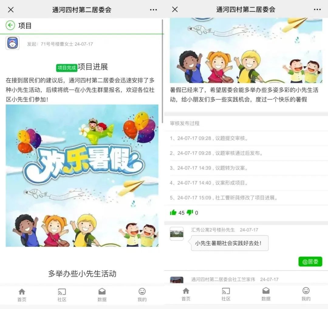 2024年,宝山区张庙街道各居民区积极发挥“社区通”的利器作用,从“议事厅”板块通过全过程人民民主的项目转化并落地到推陈出新的全科社工AI助手助力居委社工在做居民群众工作中更加顺畅。期间,张庙街道通河四村二居民区不断总结经验,围绕宝山“四个城区”建设为推进目标,结合张庙街道创新治理“六微六美”行动,高度重视居民在“社区通”平台“民事民议”,从社区“小切口”入手,切实帮助居民解决实际困难和问题,用实际行动生动实践了“小切口”撬动社区“大治理”。 据了解,正值暑假期间,居委通过“四百”大走访行动了解到社区居民非常希望社区中能多开展活动让家中的孩子们走出家门参与到社区大家庭中来,提高社交能力。为此,居委会工作人员小曹结合“议事厅”板块中居民的议题内容,进行有的放矢的设计活动。最终,确定了五场不同类型的活动内容及开展日期,如:互动泡泡秀、网络暴力安全讲座、迷你水族馆、读书分享会等。