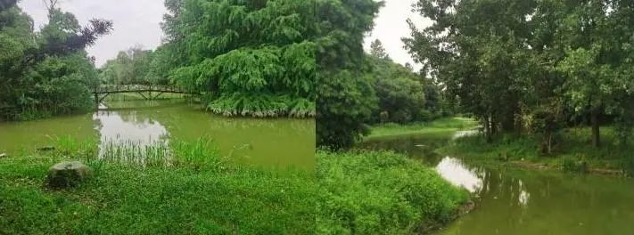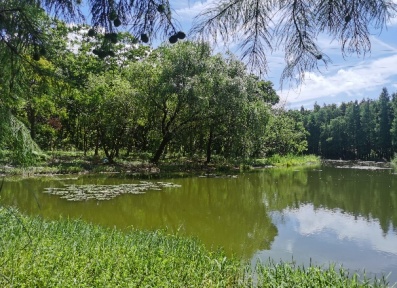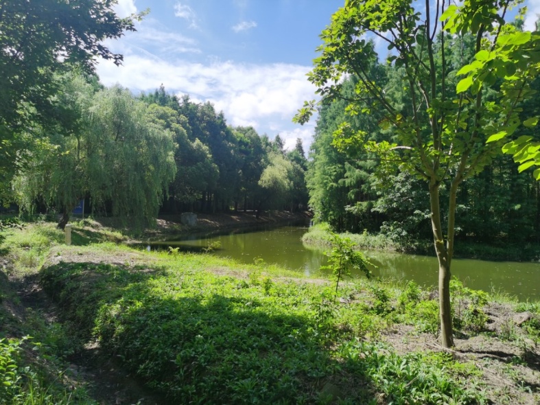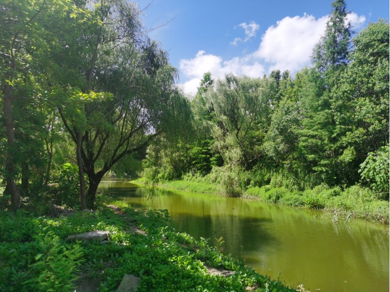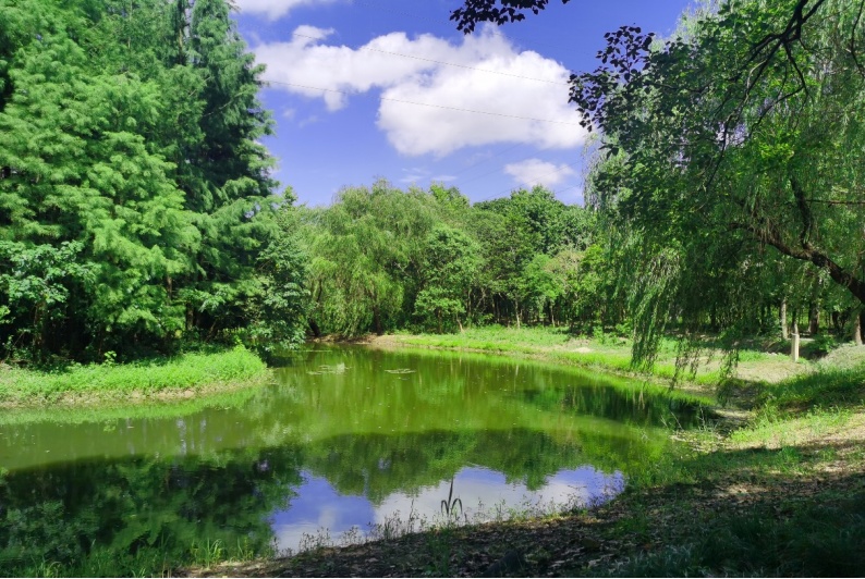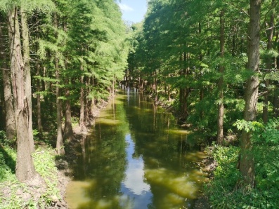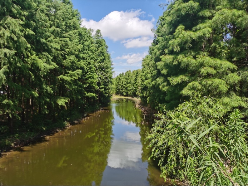 泖港生态涵养林里的水域既体现自然的柔性边界,也注重了人与自然的可亲近性与互动性,多数驳岸呈现自然状态,局部驳岸考虑人与水体亲近的需求,可观、可赏、可驻、可憩。这里植物种类繁多,有繁茂成片的落羽杉、香樟树、桉树等高大乔木,也有各种挺水植物、水生植物和水岸河旁的藤蔓植物,水色潋滟、草木葱郁、鸟语花香,已然成为浦南绝佳的生态秘境。