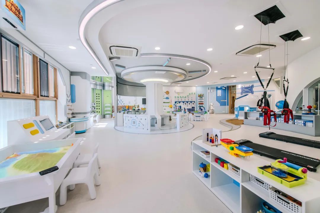 如果说主体建筑像是一个“甜甜圈”,那么草坪另一侧的上海普陀中福会早期教育研究中心(以下简称“早教中心”)则像一个“奶油小方”。不同的是,早教中心内开辟出更多活动空间,为婴幼儿感统训练提供丰富场景;教室也更注重打造“家”的氛围感,每个角落都可以“一键复制”搬回家。