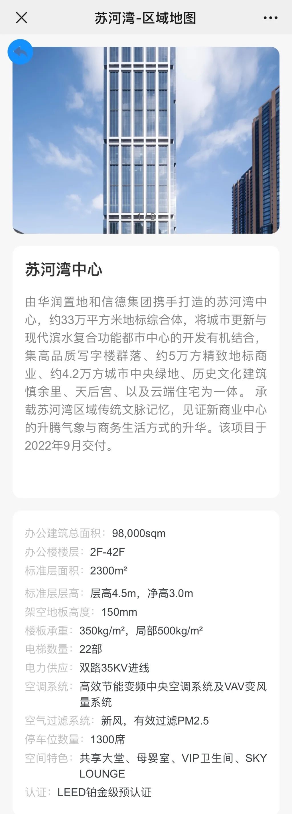 方法一:进入苏河湾公众号,点击“遇见苏河湾”,选择“区域地图”,点击对应楼宇,即可查阅包括楼宇简介和办公参数在内的相关信息。
