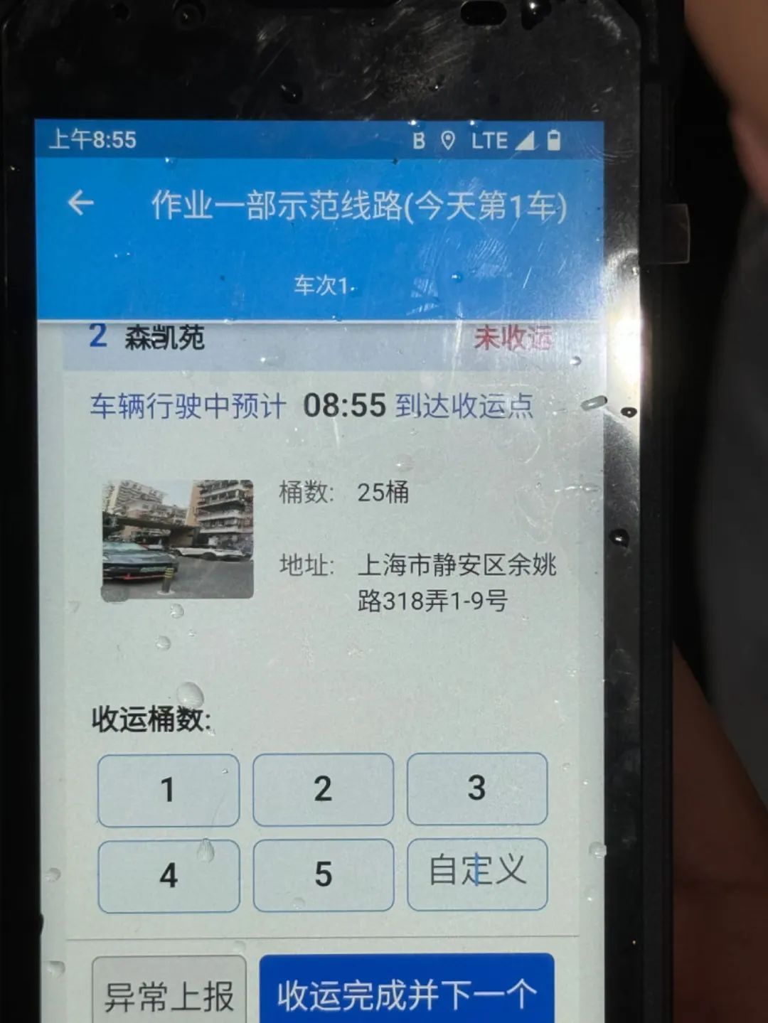 工作人员进行垃圾清运时,可实时上传当次收运量,并可及时上报收运过程中的异常情况,上报情况将同步到“垃圾清运精准报时”电子显示屏,便于属地街镇和保洁管理人员及时了解收运情况。
