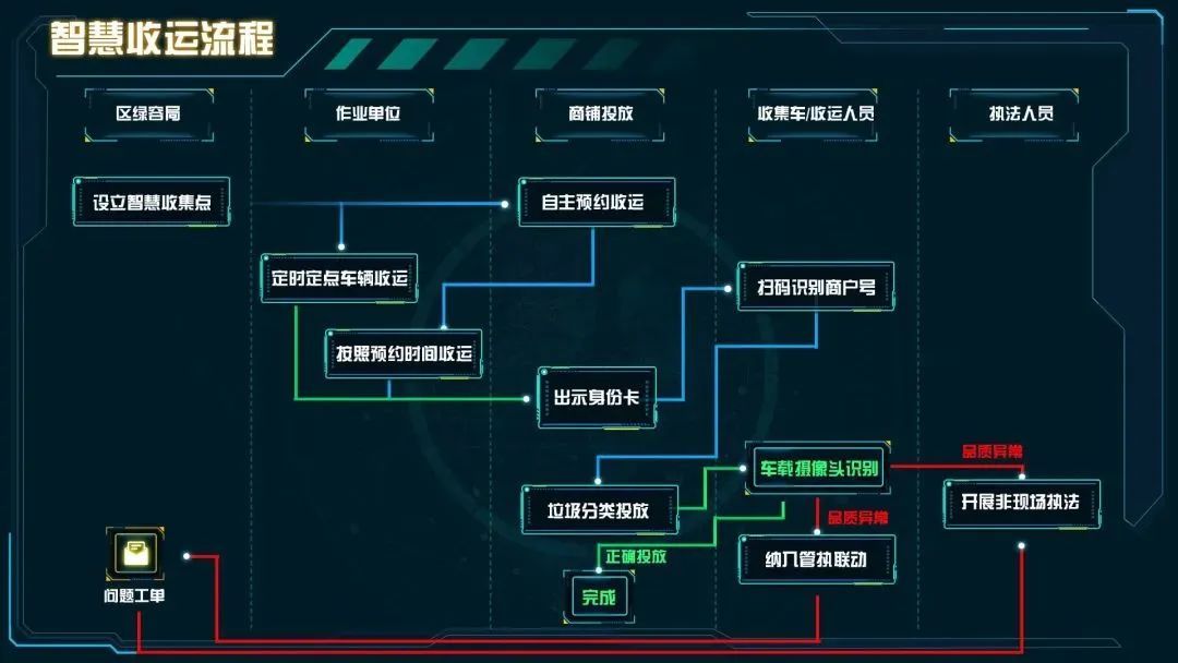 在清运车辆上配置AI智能摄像头、分类纯净度识别模块、称重计量等感知设备,精细化监管商户交付的生活垃圾纯净度和交付量,实现生活垃圾品质问题发现、溯源的闭环管理。