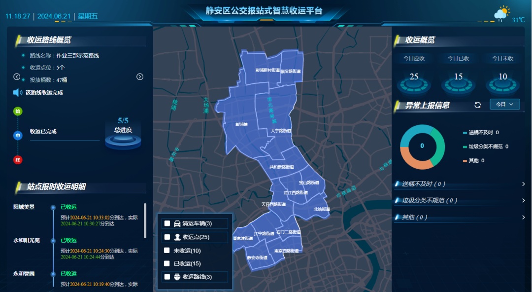 同时,通过对垃圾清运车辆到达时间和清运过程精准预报和实时记录,实现数据化管理,为管理部门优化方案和决策提供依据。
