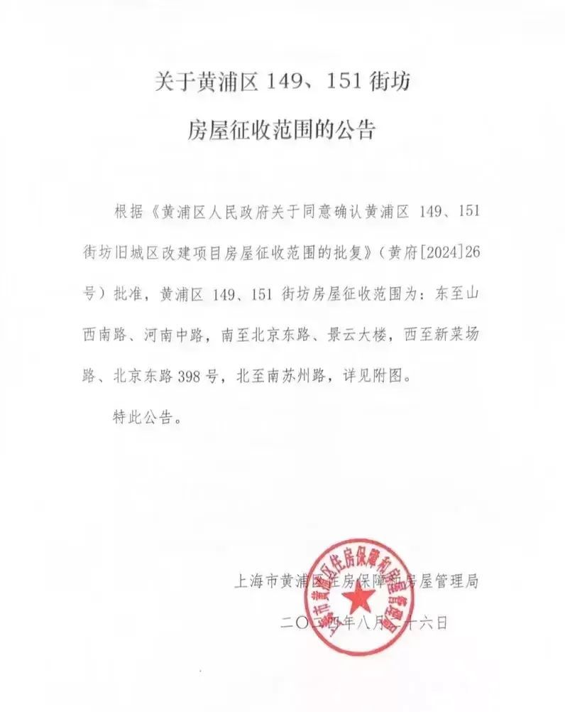 近日,根据《黄浦区人民政府关于同意确认黄浦区149、151街坊旧城区改建项目房屋征收范围的批复》(黄府〔2024〕26号)批准,靠近苏州河、仅200多证居民的黄浦区149、151街坊,正式启动旧改征收。