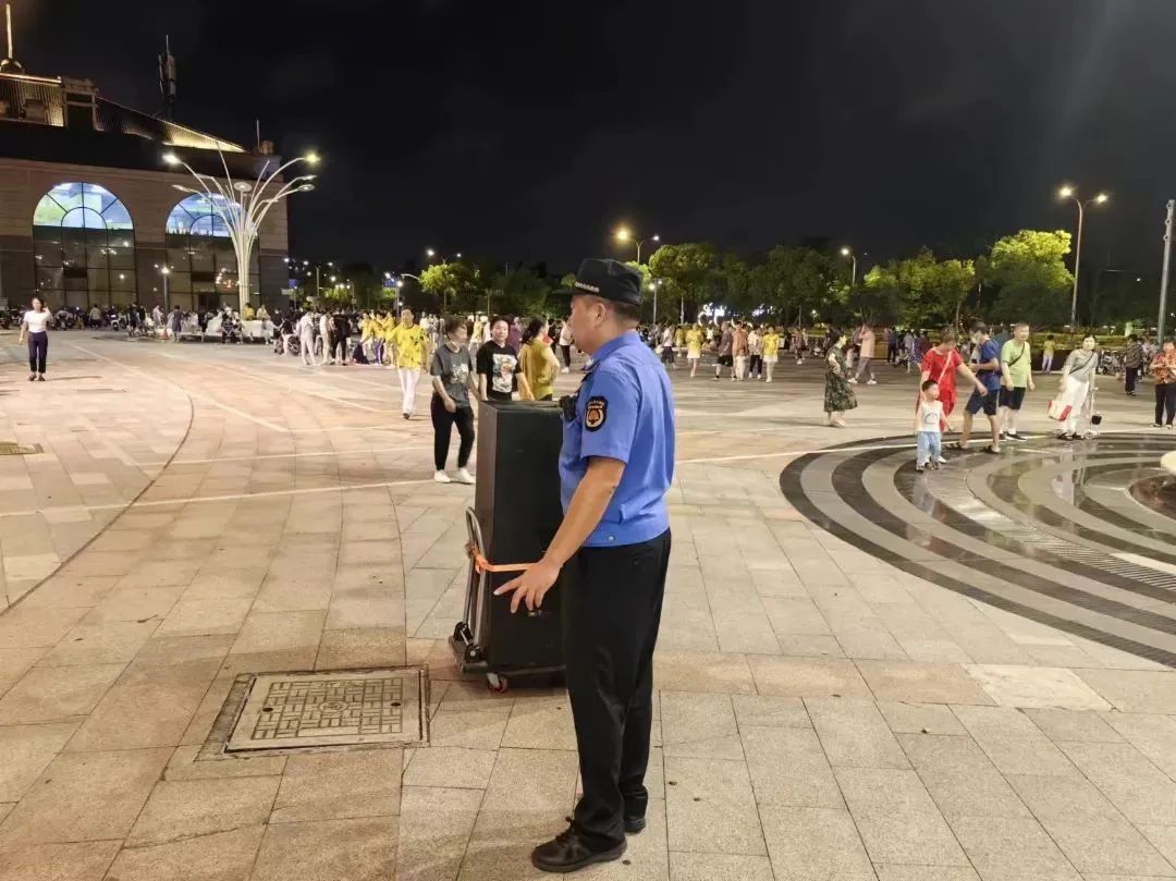 “这边场地比较宽敞,最近晚上天气又蛮舒适的,大家就在这边跳跳舞、健健身。”“没想到声音这么大了打扰到大家,实在不好意思!”听了队员们的劝导,现场跳舞的市民群众纷纷表示理解并积极配合,主动降低音箱音量,有效降噪。