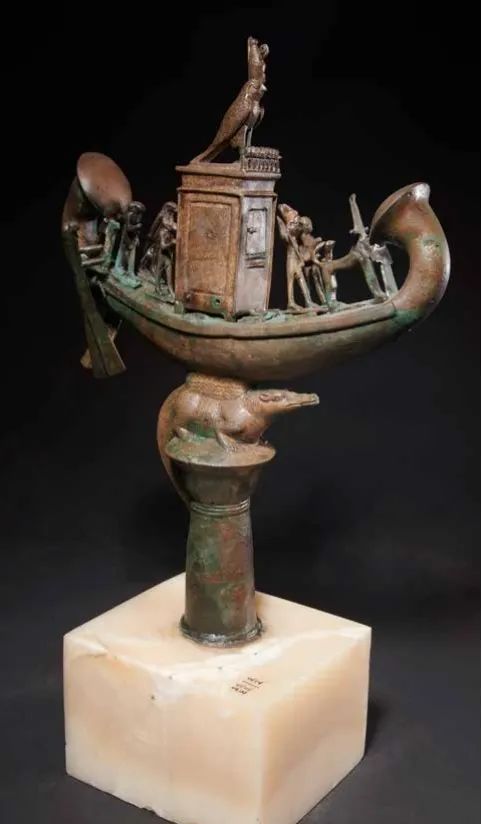 这件青铜荷鲁斯圣船像所描述的场景正是庆祝荷鲁斯对塞特的胜利。荷鲁斯在这只圣船上拥有三种不同的表现形式,此外还有表现伊西斯在尼罗河三角洲隐蔽的芦苇丛里给儿童荷鲁斯哺乳的场景,在船的尾部还可以看到呈荷鲁斯形态的两只船桨。
