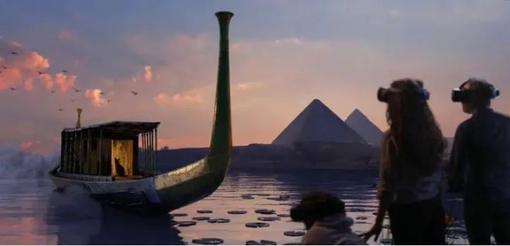 沉浸式VR体验:坐上法老太阳船穿越金字塔和尼罗河。