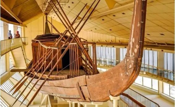 最著名的太阳船属胡夫法老的金字塔下发现的太阳船了。这艘长达43.6米的巨船,由1224块木板巧妙拼接而成,没有使用一颗钉子,全靠绳索和榫接技术固定。