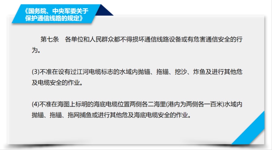 通信海缆保护区界定为通信海缆路由位置两侧各二海里(港内为两侧各一百米)水域内。