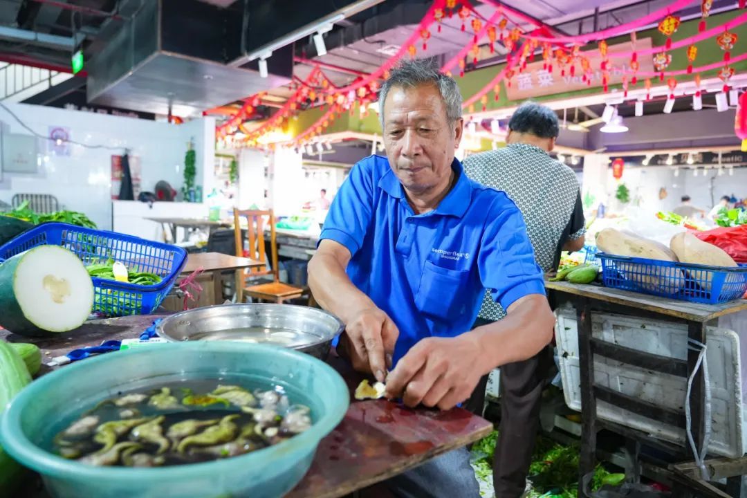 菱角是当前很俏的时鲜货,在沈老伯蔬菜摊的“C位”上,摆放着一盆绿绿的菱角。硕大饱满、清甜美味的新鲜菱角受到不少市民的喜爱。