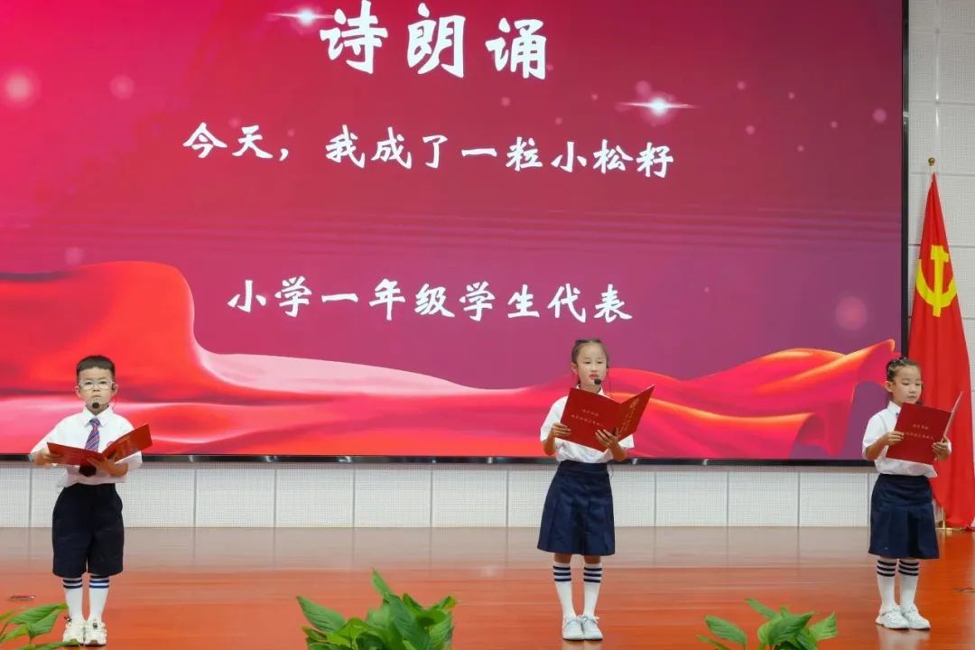 在开办典礼上,特邀主持人——机器人“松松”——与一年级新生进行了愉快的互动,展现了学校科技创新的教育特色。新生们以朗诵原创诗歌《今天,我成了一粒“小松籽”》的形式,表达了他们对新生活的憧憬和期待。华二系领导们亲临现场,为新生们颁发了学生证,寄予了深厚的期望。