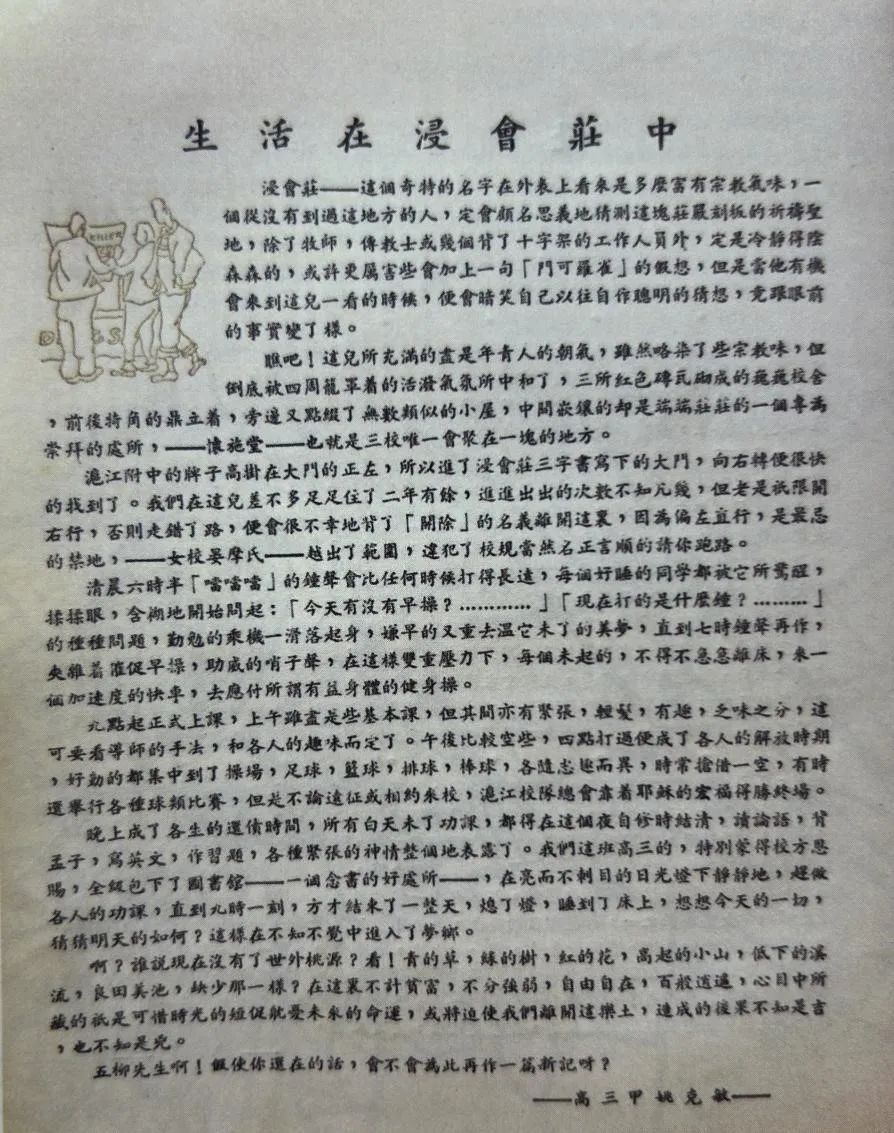 高一甲组姚克敏在1949年沪江附中的年刊中提道与女校邻近的“尴尬”:我们在这儿差不多足足住了二年有余,进进出出的次数不知凡几,但老是只限开右行,否则走错了路,便会很不幸地背了“开除”的名义离开这里,因为偏左直行,是最忌的禁地,——女校晏摩氏——越出了范围,违犯了校规当然名正言顺的请你跑路。