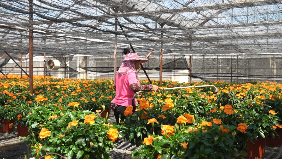 湿热又漫长的夏季,在位于浦东新区的上海锦彩园艺有限公司里,温室大棚的温度几乎达到了40℃,但这里却是一片繁花盛开的美好景象:烈日下,路边的挂袋长春花粉嫩可爱;温室大棚里,鸟尾花、繁星、舞春花等盆栽花卉开得热闹。