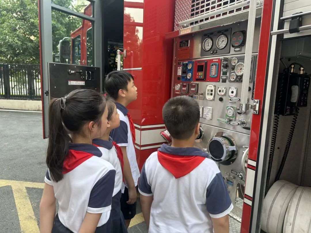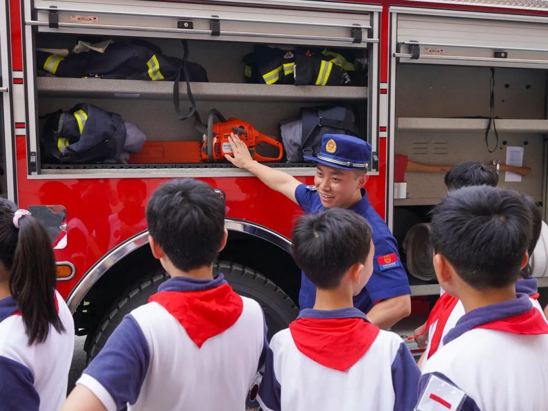 室内教学结束后,同学们来到操场集合,眼前停着的消防车、灭火救援装备、消防缓降器……让同学们直呼“大开眼界”,仿佛置身于一个小型消防救援站。孩子们争相参观消防车内部结构,了解消防车的各种功能,对消防员的日常工作有了更直观的认识。