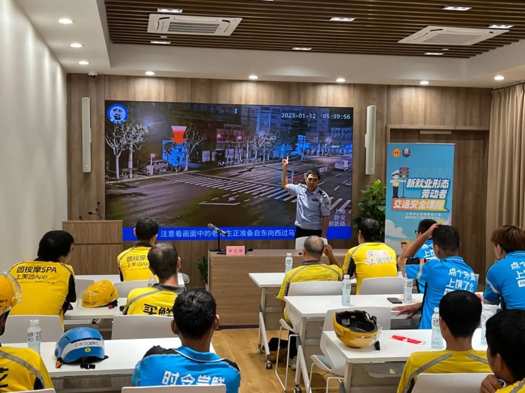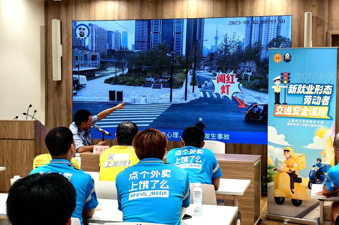 9月2日,静安区总工会联合上海市公安局静安分局,邀请静安交警支队警官走进区总工会职工服务中心户外职工爱心接力站,为美团、饿了么外卖骑手宣讲交通安全“秋季第一课”,进一步推动服务“两企三新”走深走实,牢固树立新就业形态劳动者交通安全意识,坚持“生命至上、安全第一”,着力消除交通安全隐患,守护骑手出行之路。