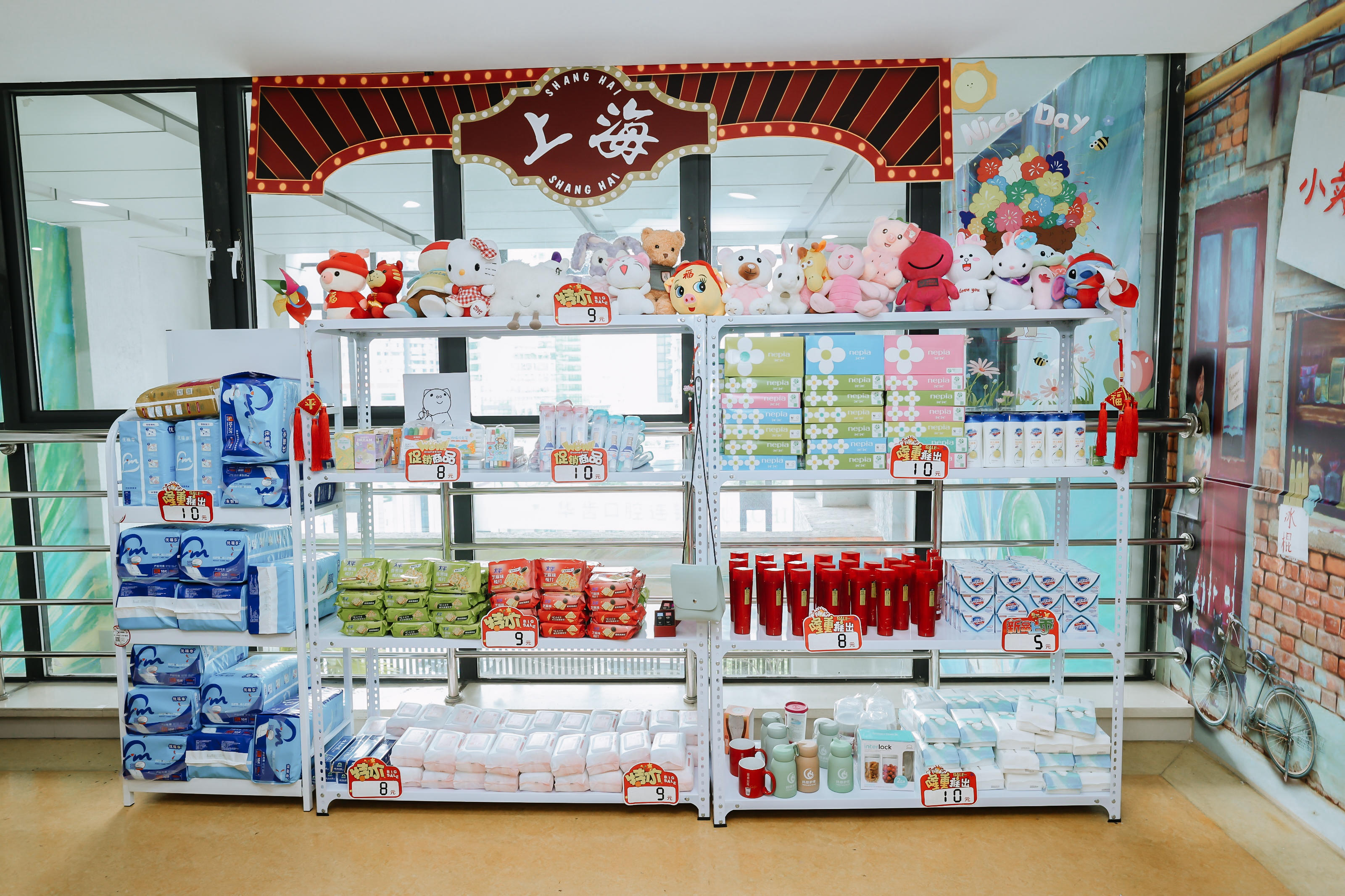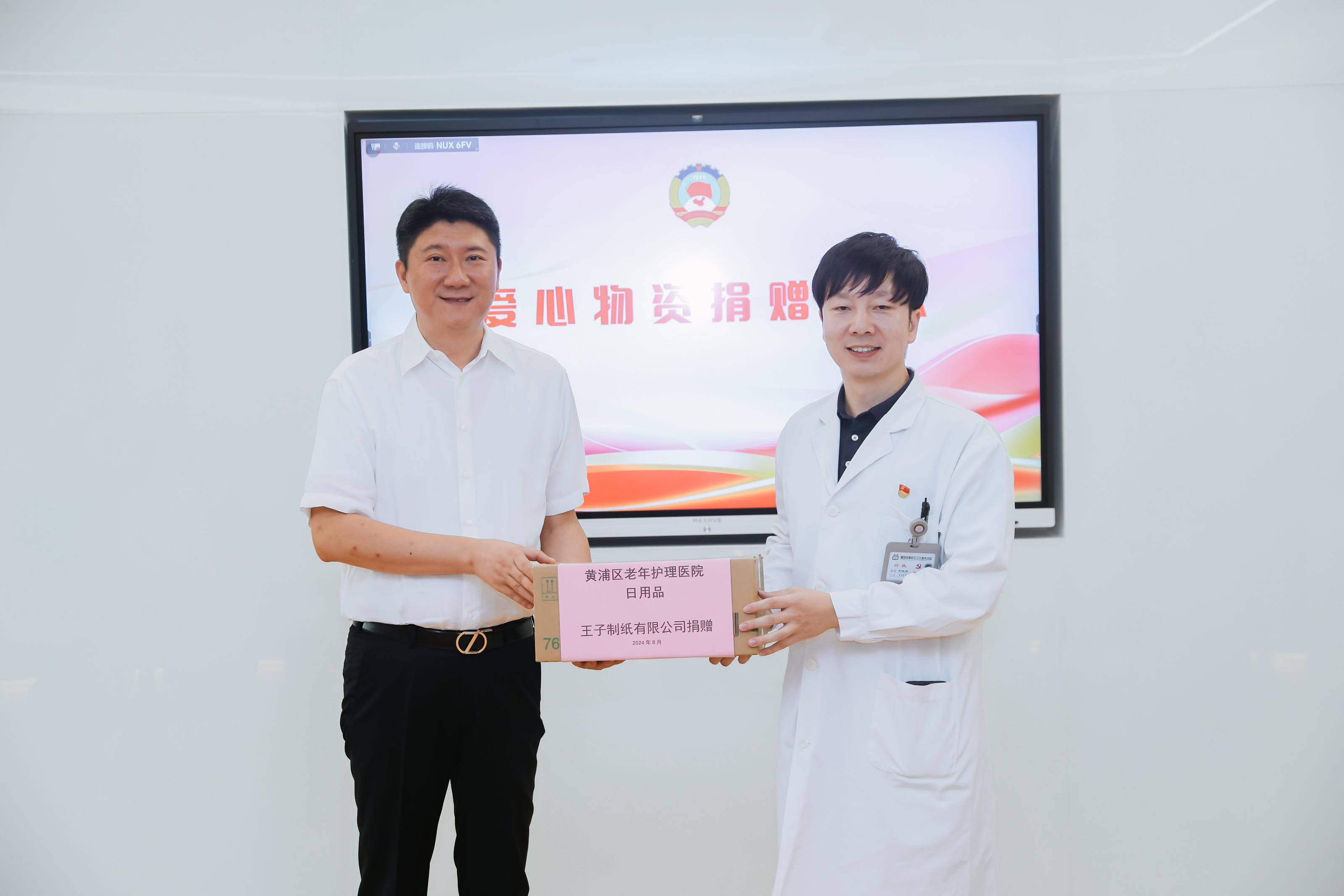 江苏王子制纸有限公司上海分公司部长乌明欣委员,罗森(中国)投资有限公司总裁室高级经理张颖委员为医院内“第八百货”记忆商场捐赠爱心物资。