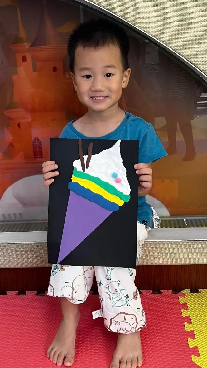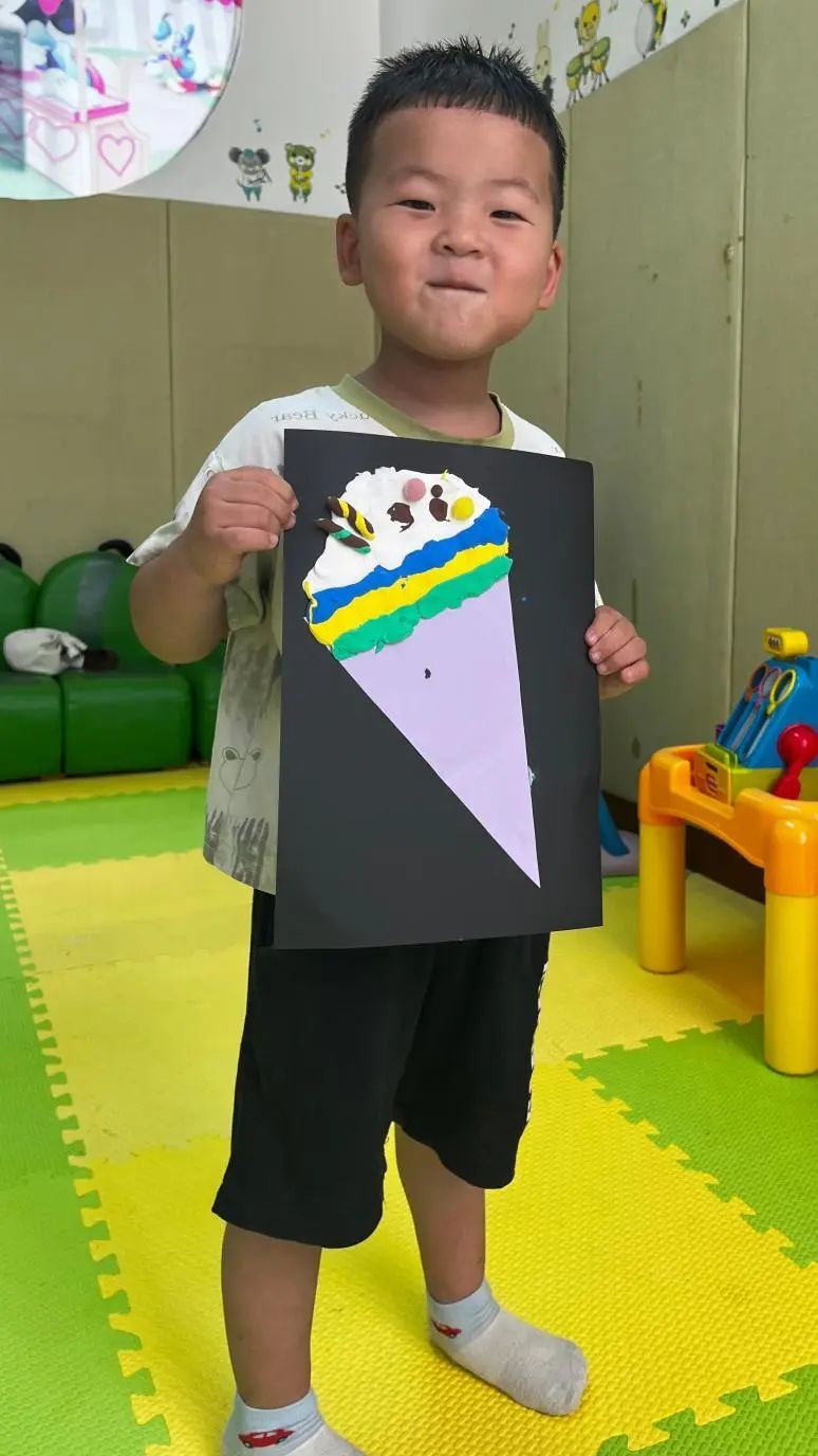 在手工制作环节,孩子们动手制作了可爱的“冰淇淋”拼贴画。孩子们温习了三角形的形状,并在老师的指导下,学会了使用胶棒,配合彩泥和彩球,揉搓、按压,进一步锻炼了动手能力。
